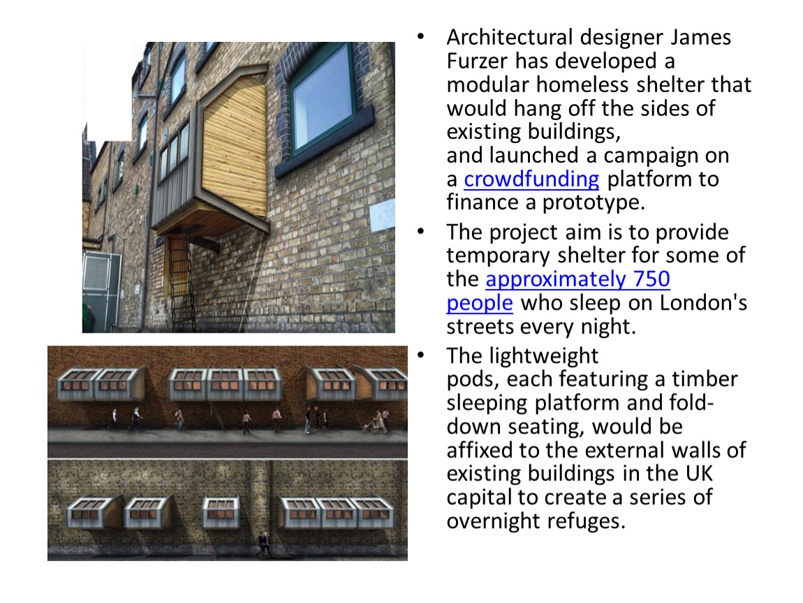 Architectural designer James Furzer has developed a modular homeless shelter that would hang off the sides of existing buildings, and launched a campaign on a crowdfunding platform to finance a prototype.