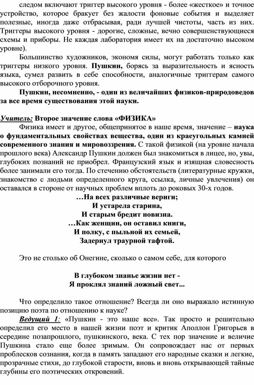 Ведущий 2: Известно, что нового в научной работе можно добиться, только усовершенствовав методы исследования: более чувствительная аппаратура, лучший, чем прежде, метод анализа. Все это мы находим в творческой «лаборатории» Пушкина: метод наблюдения и анализирующие возможности его были намного совершеннее и эффективнее, чем у других «исследователей природы». Используя терминологию физики высоких энергий, можно сказать, что пушкинский метод характеризуется наличием «триггеров высокого уровня». (Триггер - элемент логической схемы отбора событий в экспериментальной установке.) Триггер нижнего уровня - сравнительно простое устройство, которое наряду с нужными событиями допускает большое число посторонних (фоновых), так сказать, «мусора». Главная его цель - не выбросить нужные события, пусть даже допуская частично фоновые (ложные) события. Но с такой «смесью» трудно рассчитывать на успех: «мусор» забивает и искажает результаты. Тогда следом включают триггер высокого уровня - более «жесткое» и точное устройство, которое бракует без жалости фоновые события и выделяет полезные, иногда даже отбрасывая, ради лучшей чистоты, часть из них. Триггеры высокого уровня - дорогие, сложные, вечно совершенствующиеся схемы и приборы. Не каждая лаборатория имеет их на достаточно высоком уровне).