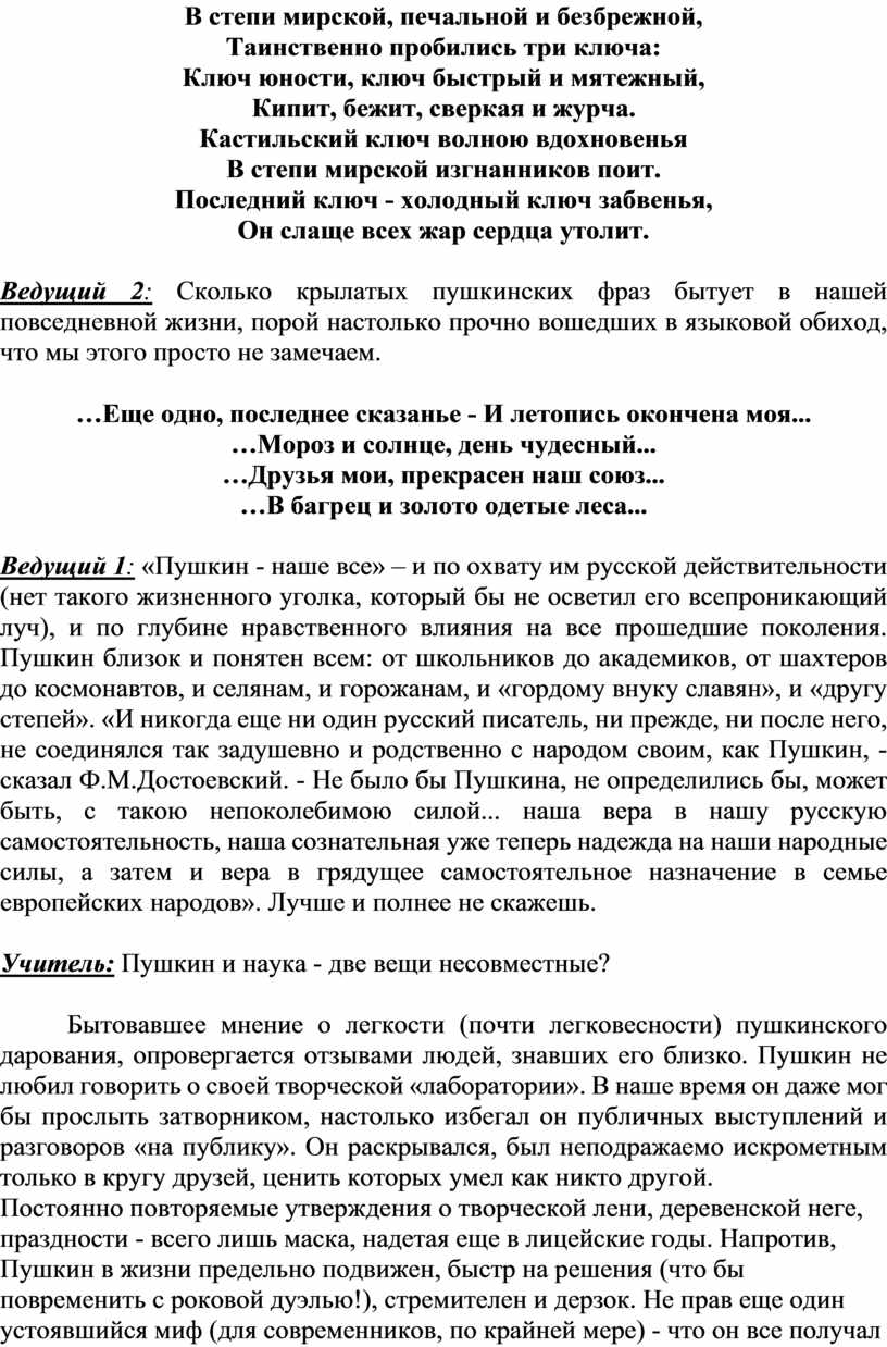 Ведущий 1: «Пушкин - наше все» – и по охвату им русской действительности (нет такого жизненного уголка, который бы не осветил его всепроникающий луч), и по глубине нравственного влияния на все прошедшие поколения. Пушкин близок и понятен всем: от школьников до академиков, от шахтеров до космонавтов, и селянам, и горожанам, и «гордому внуку славян», и «другу степей». «И никогда еще ни один русский писатель, ни прежде, ни после него, не соединялся так задушевно и родственно с народом своим, как Пушкин, - сказал Ф.М.Достоевский. - Не было бы Пушкина, не определились бы, может быть, с такою непоколебимою силой... наша вера в нашу русскую самостоятельность, наша сознательная уже теперь надежда на наши народные силы, а затем и вера в грядущее самостоятельное назначение в семье европейских народов». Лучше и полнее не скажешь.