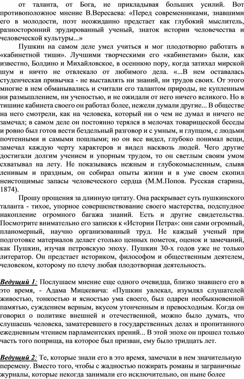 Ведущий 1: Послушаем мнение еще одного очевидца, близко знавшего его в это время, - Адама Мицкевича: «Пушкин увлекал, изумлял слушателей живостью, тонкостью и ясностью ума своего, был одарен необыкновенной памятью, суждением верным, вкусом утонченным и превосходным. Когда он говорил о политике внешней и отечественной, можно было думать, что слушаешь человека, заматеревшего в государственных делах и пропитанного ежедневным чтением парламентских прений... В этой эпохе он прошел только часть того поприща, на которое был призван, ему было тридцать лет.