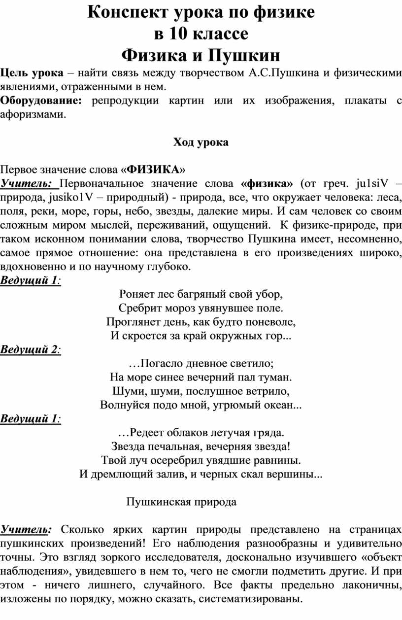Учитель: Первоначальное значение слова «физика» (от греч. ju1siV – природа, jusiko1V – природный) - природа, все, что окружает человека: леса, поля, реки, море, горы, небо, звезды, далекие миры. И сам человек со своим сложным миром мыслей, переживаний, ощущений. К физике-природе, при таком исконном понимании слова, творчество Пушкина имеет, несомненно, самое прямое отношение: она представлена в его произведениях широко, вдохновенно и по научному глубоко.