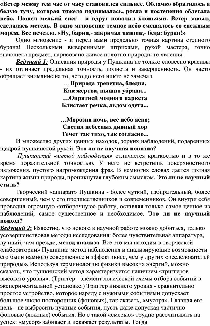 Пушкинский «метод наблюдения» отличается краткостью и в то же время поразительной точностью. У него не встретишь поверхностного изложения, пустого нагромождения фраз. В немногих словах дается полная картина жизни природы, проникнутая глубоким смыслом. Это ли не научный стиль?