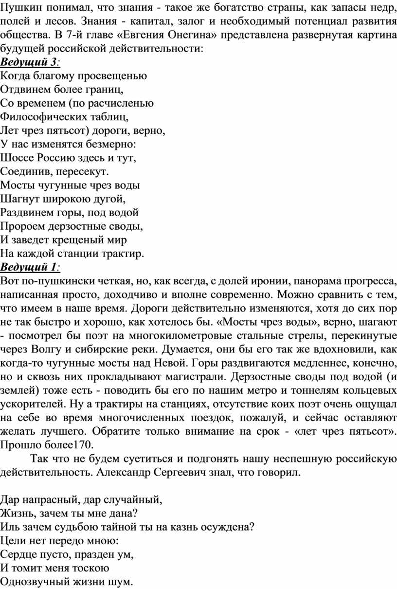 Пушкин понимал, что знания - такое же богатство страны, как запасы недр, полей и лесов. Знания - капитал, залог и необходимый потенциал развития общества. В 7-й главе «Евгения Онегина» представлена развернутая картина будущей российской действительности: