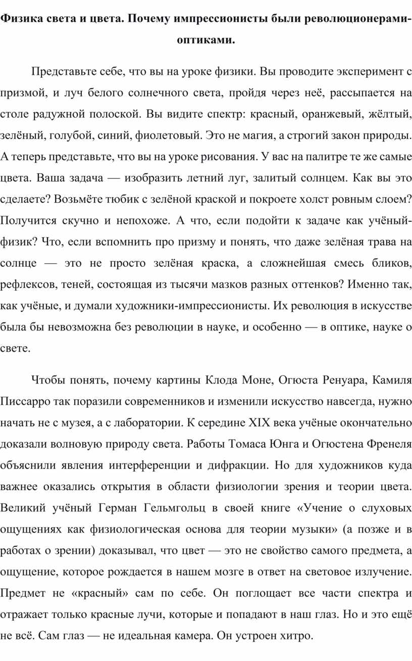 Представьте себе, что вы на уроке физики. Вы проводите эксперимент с призмой, и луч белого солнечного света, пройдя через неё, рассыпается на столе радужной полоской. Вы видите спектр: красный, оранжевый, жёлтый, зелёный, голубой, синий, фиолетовый. Это не магия, а строгий закон природы. А теперь представьте, что вы на уроке рисования. У вас на палитре те же самые цвета. Ваша задача — изобразить летний луг, залитый солнцем. Как вы это сделаете? Возьмёте тюбик с зелёной краской и покроете холст ровным слоем? Получится скучно и непохоже. А что, если подойти к задаче как учёный-физик? Что, если вспомнить про призму и понять, что даже зелёная трава на солнце — это не просто зелёная краска, а сложнейшая смесь бликов, рефлексов, теней, состоящая из тысячи мазков разных оттенков? Именно так, как учёные, и думали художники-импрессионисты. Их революция в искусстве была бы невозможна без революции в науке, и особенно — в оптике, науке о свете.