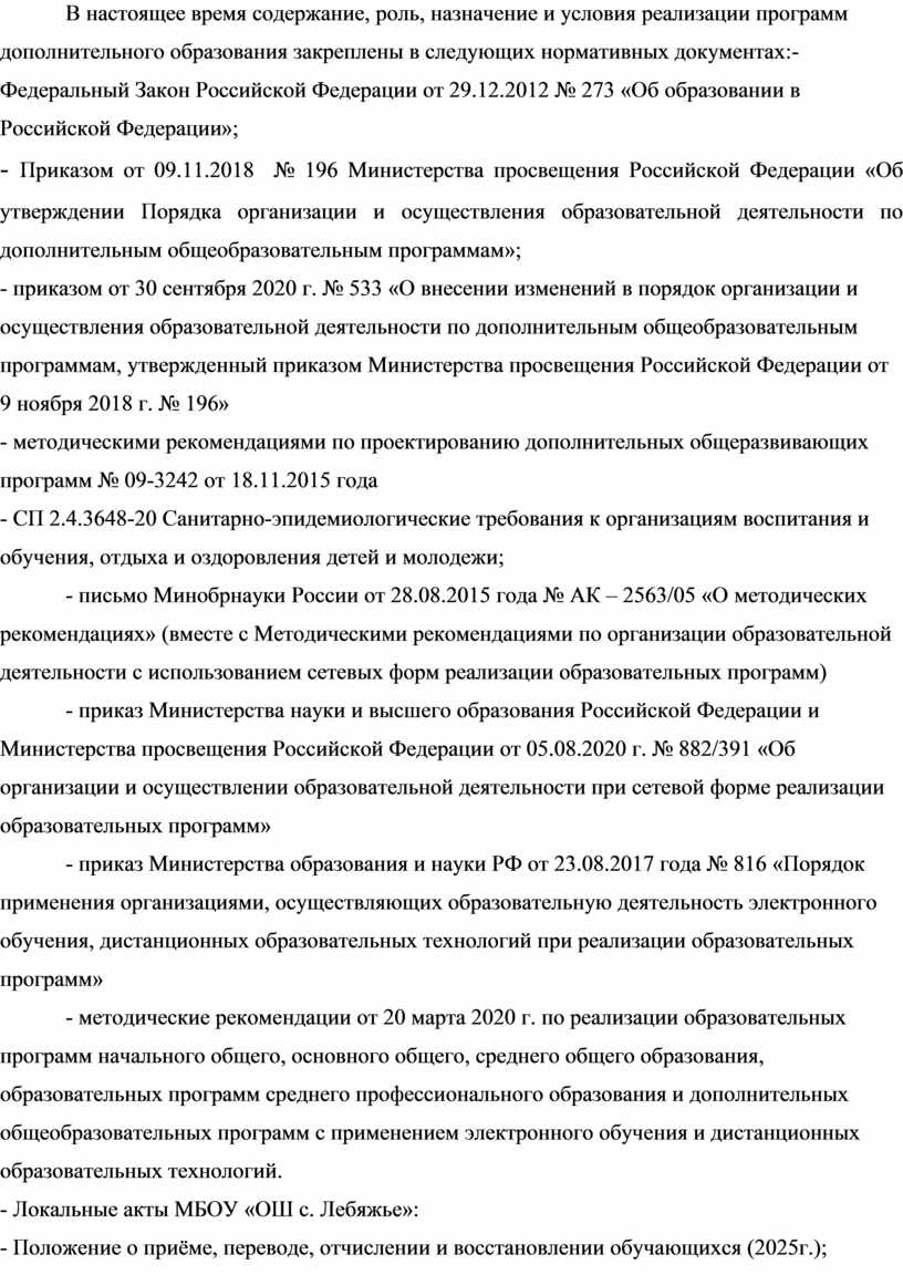- приказом от 30 сентября 2020 г. № 533 «О внесении изменений в порядок организации и осуществления образовательной деятельности по дополнительным общеобразовательным программам, утвержденный приказом Министерства просвещения Российской Федерации от 9 ноября 2018 г. № 196»