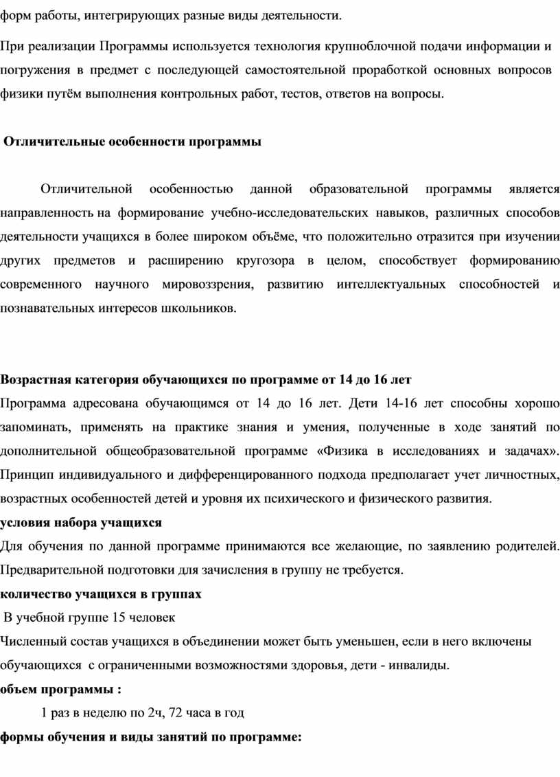 В Программе предусмотрено значительное увеличение активных форм работы, направленных не только на вовлечение обучающихся в научно- исследовательскую деятельность и обеспечение понимания ими физических основ окружающего мира, но и на приобретение навыков и умений самостоятельно искать новую информацию и различные пути решения физических задач разного уровня сложности.