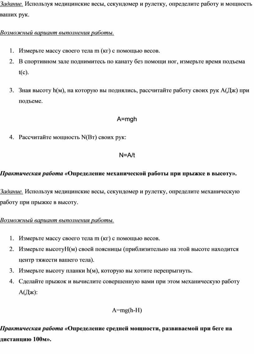 Задание. Используя медицинские весы, секундомер и рулетку, определите механическую работу при прыжке в высоту.