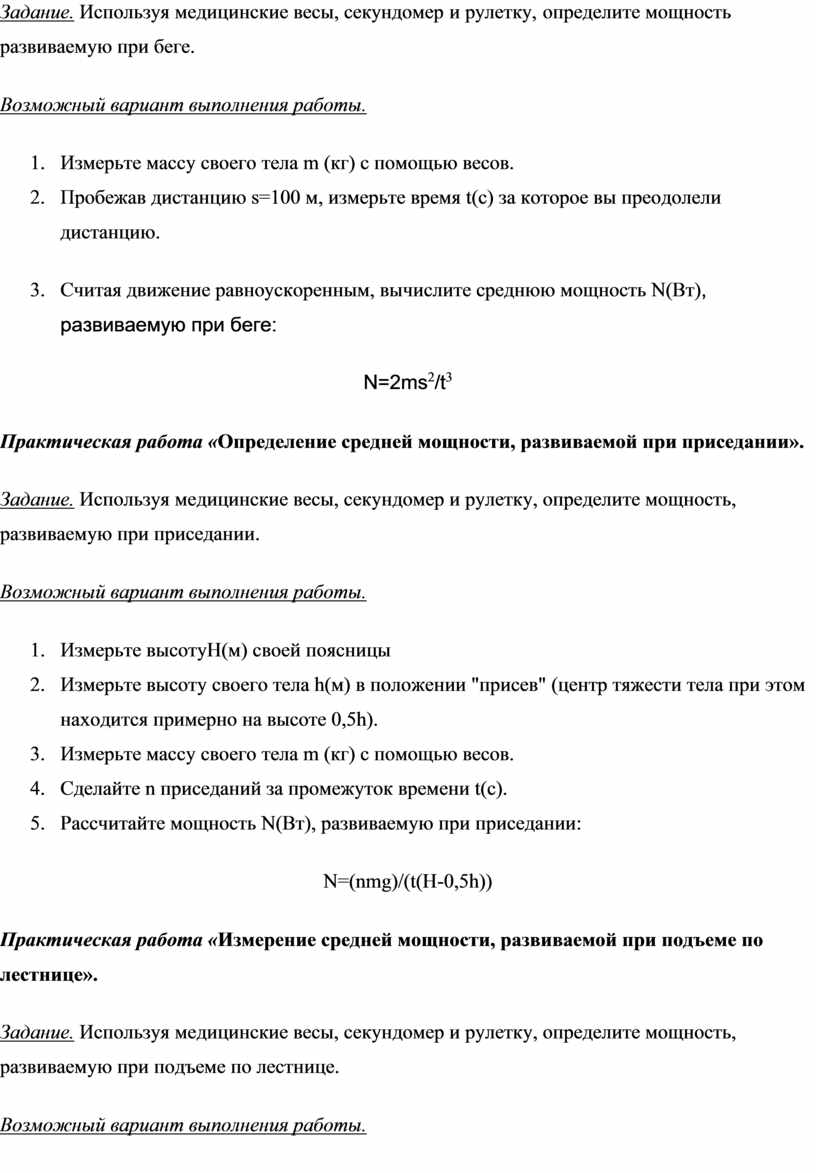 Задание. Используя медицинские весы, секундомер и рулетку, определите мощность развиваемую при беге.