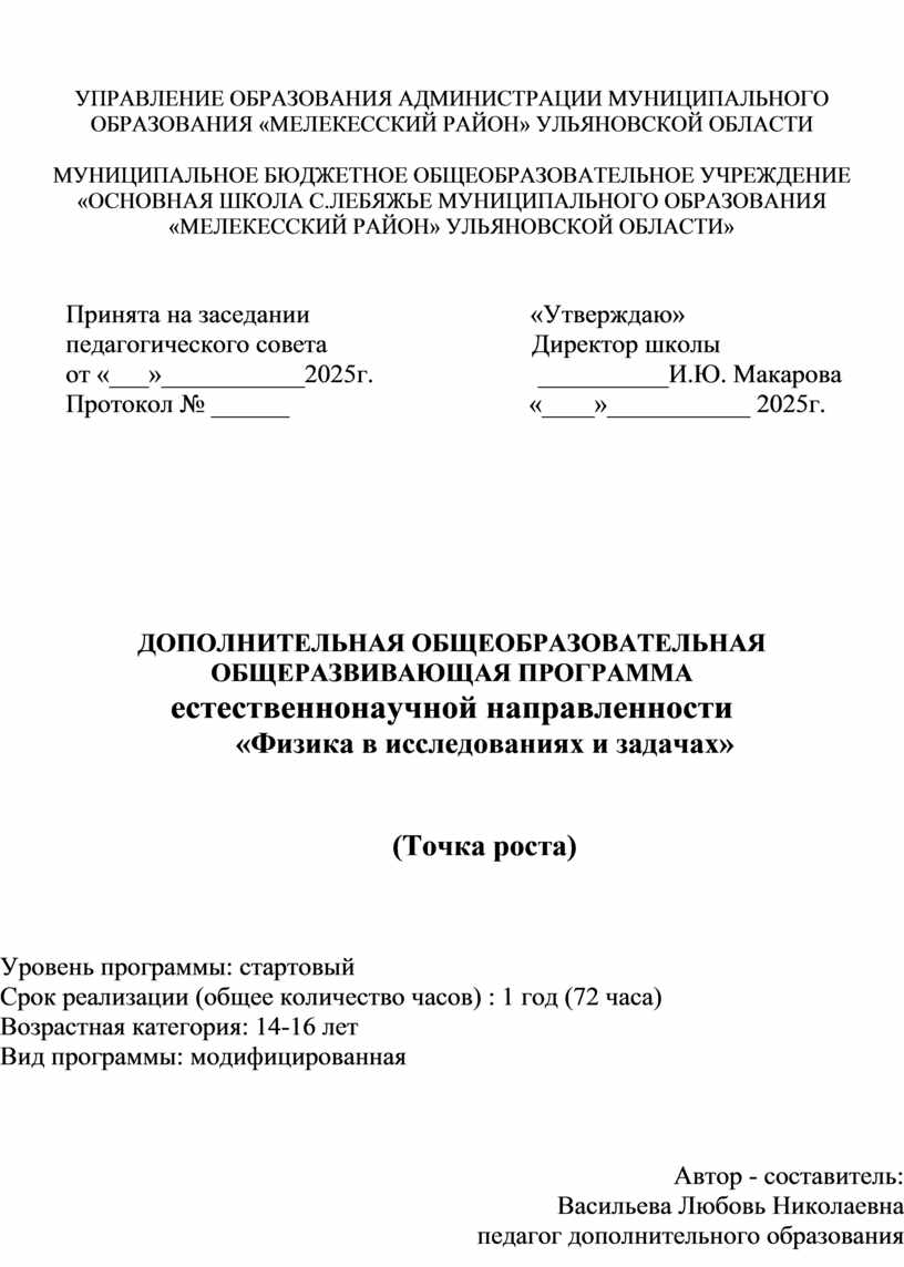1. Комплекс основных характеристик дополнительной общеобразовательной общеразвивающей программы «Физика в исследованиях и задачах»