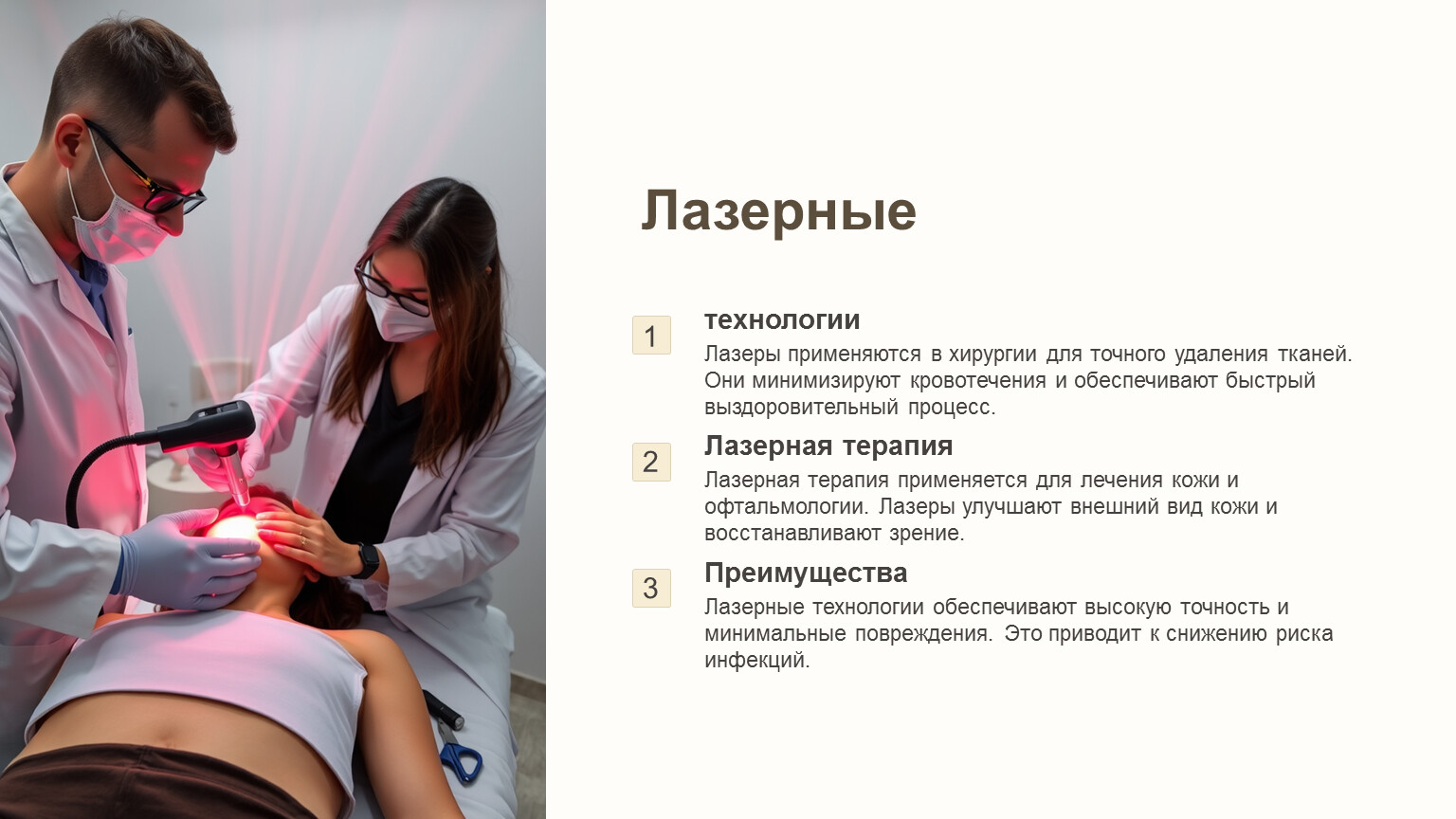 Лазеры применяются в хирургии для точного удаления тканей. Они минимизируют кровотечения и обеспечивают быстрый выздоровительный процесс.