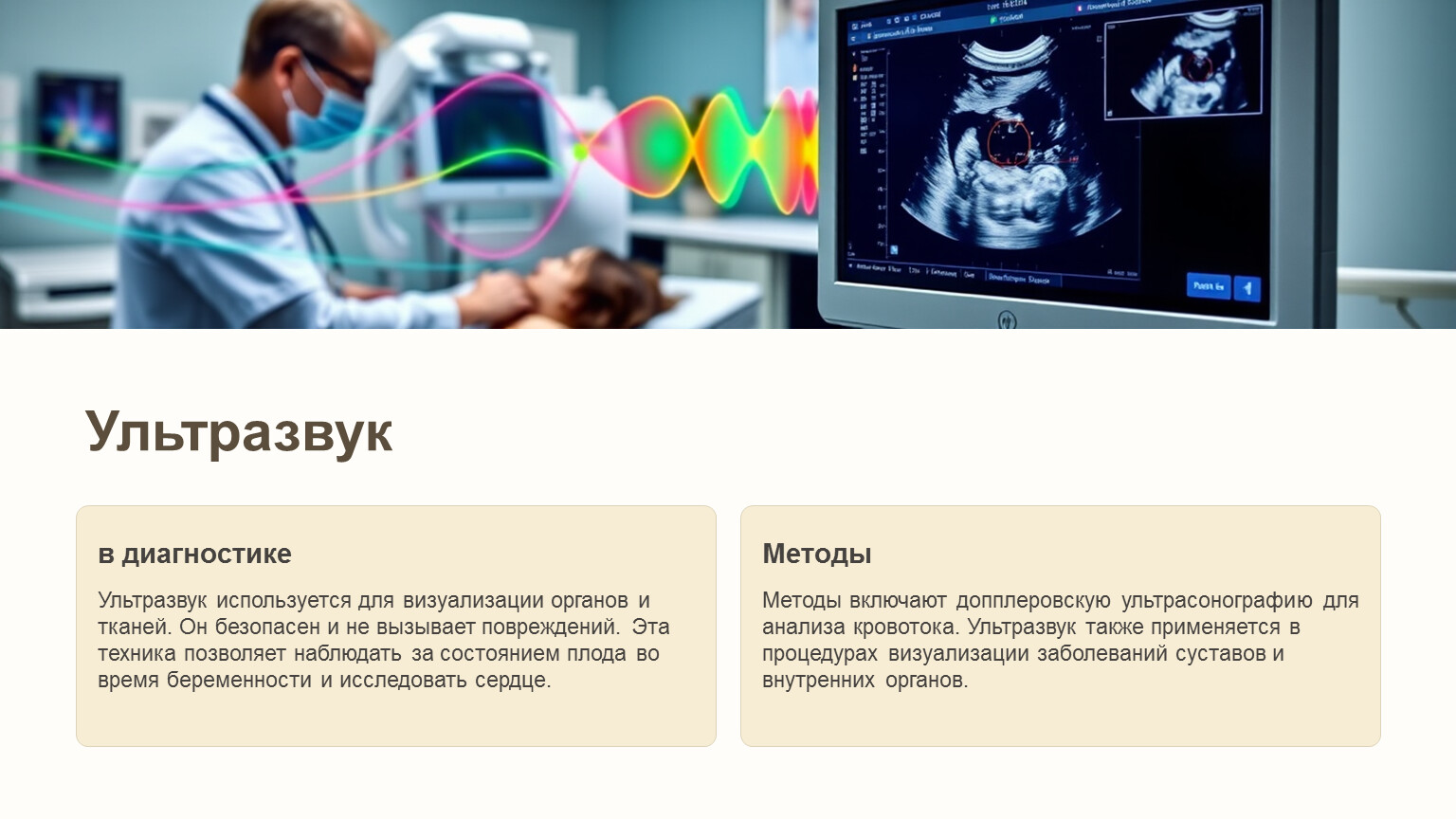Ультразвук используется для визуализации органов и тканей. Он безопасен и не вызывает повреждений. Эта техника позволяет наблюдать за состоянием плода во время беременности и исследовать сердце.