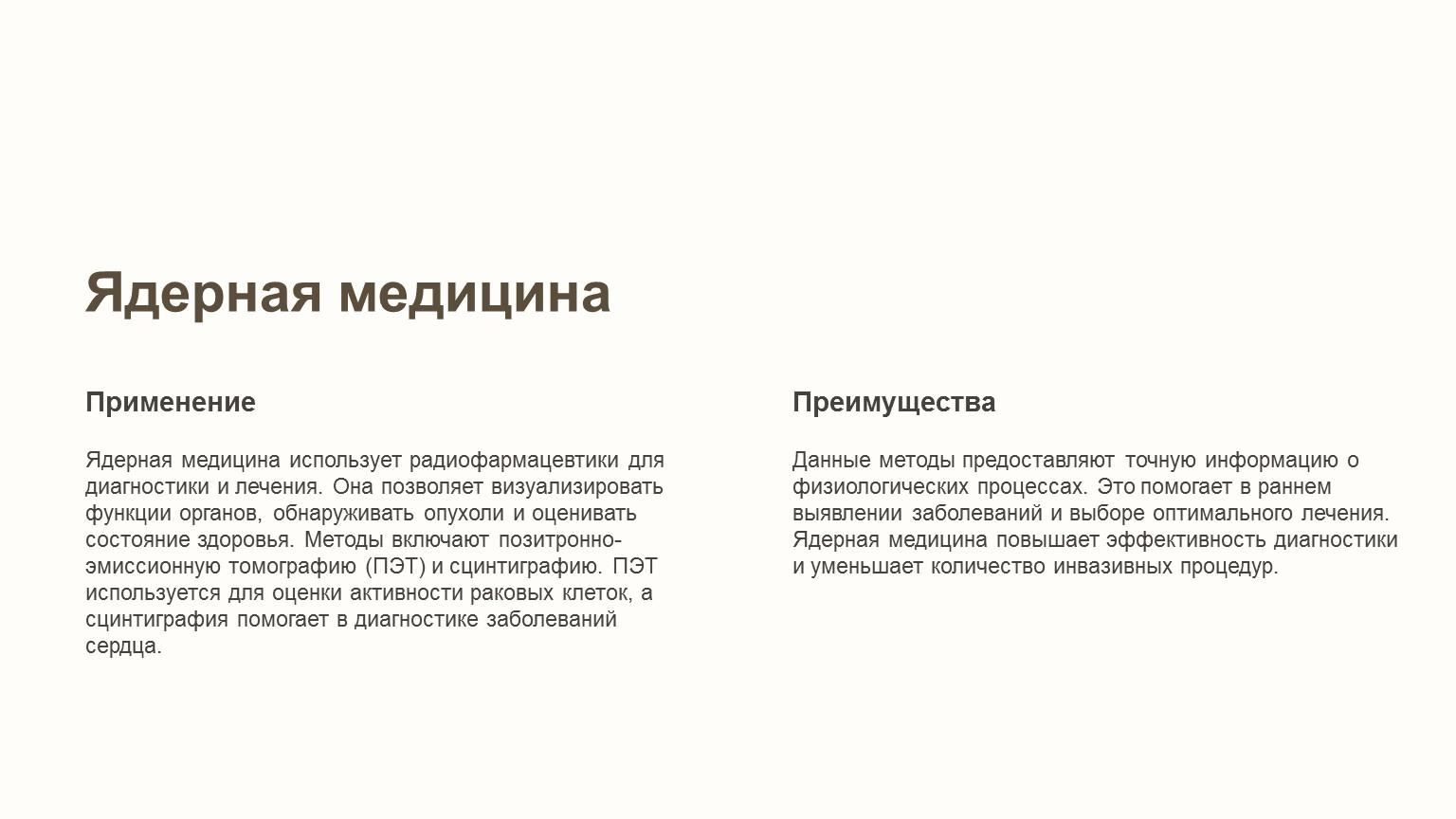 Ядерная медицина использует радиофармацевтики для диагностики и лечения. Она позволяет визуализировать функции органов, обнаруживать опухоли и оценивать состояние здоровья. Методы включают позитронно-эмиссионную томографию (ПЭТ) и сцинтиграфию. ПЭТ используется для оценки активности раковых клеток, а сцинтиграфия помогает в диагностике заболеваний сердца.