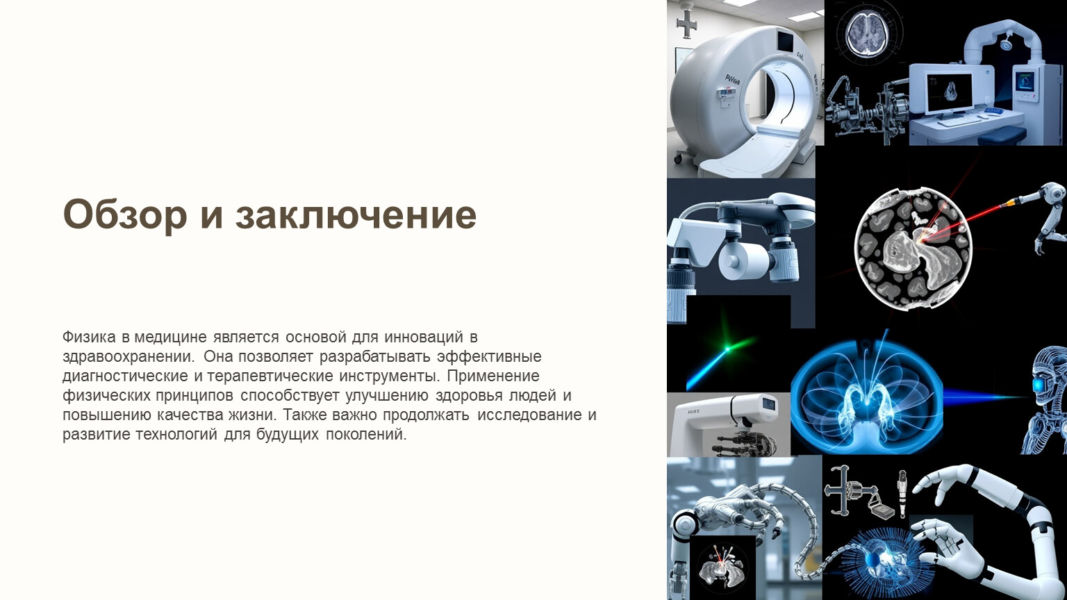 Физика в медицине является основой для инноваций в здравоохранении. Она позволяет разрабатывать эффективные диагностические и терапевтические инструменты. Применение физических принципов способствует улучшению здоровья людей и повышению качества жизни. Также важно продолжать исследование и развитие технологий для будущих поколений.
