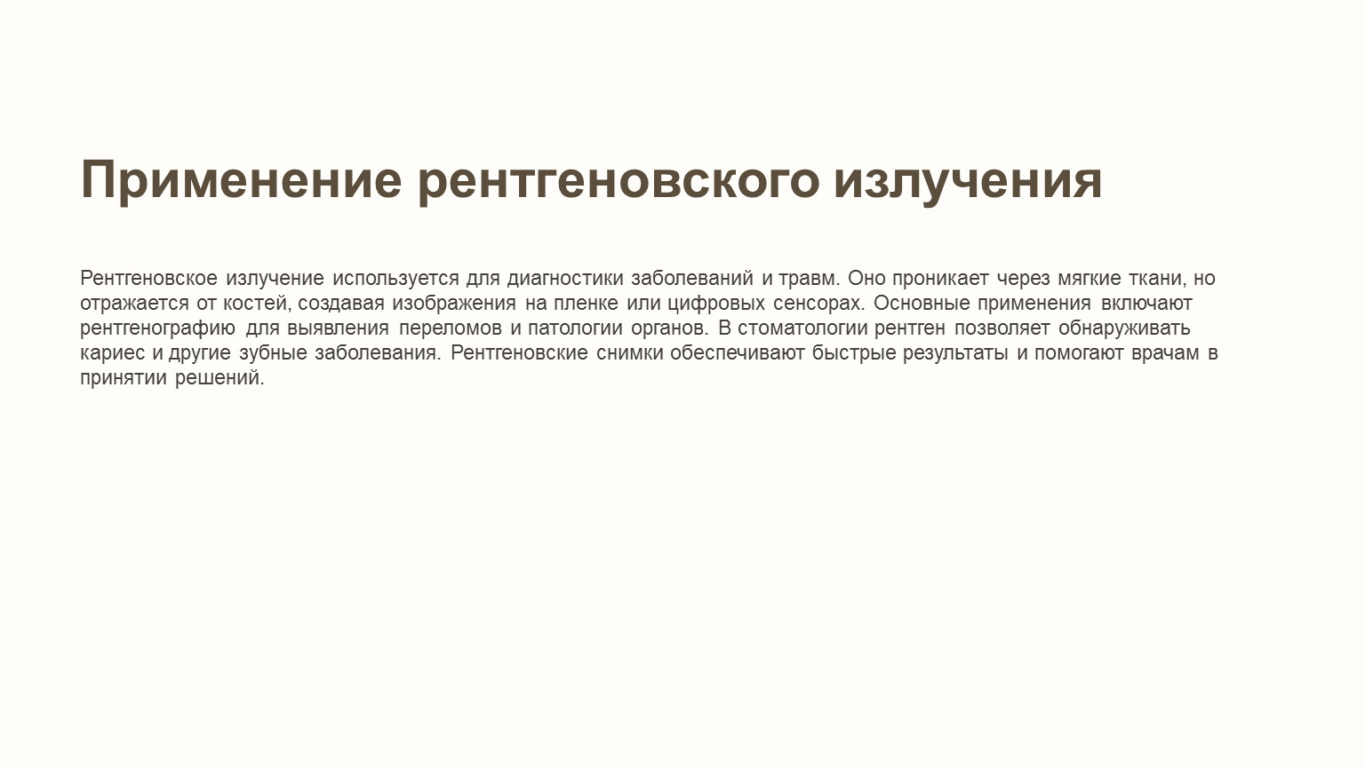 Рентгеновское излучение используется для диагностики заболеваний и травм. Оно проникает через мягкие ткани, но отражается от костей, создавая изображения на пленке или цифровых сенсорах. Основные применения включают рентгенографию для выявления переломов и патологии органов. В стоматологии рентген позволяет обнаруживать кариес и другие зубные заболевания. Рентгеновские снимки обеспечивают быстрые результаты и помогают врачам в принятии решений.