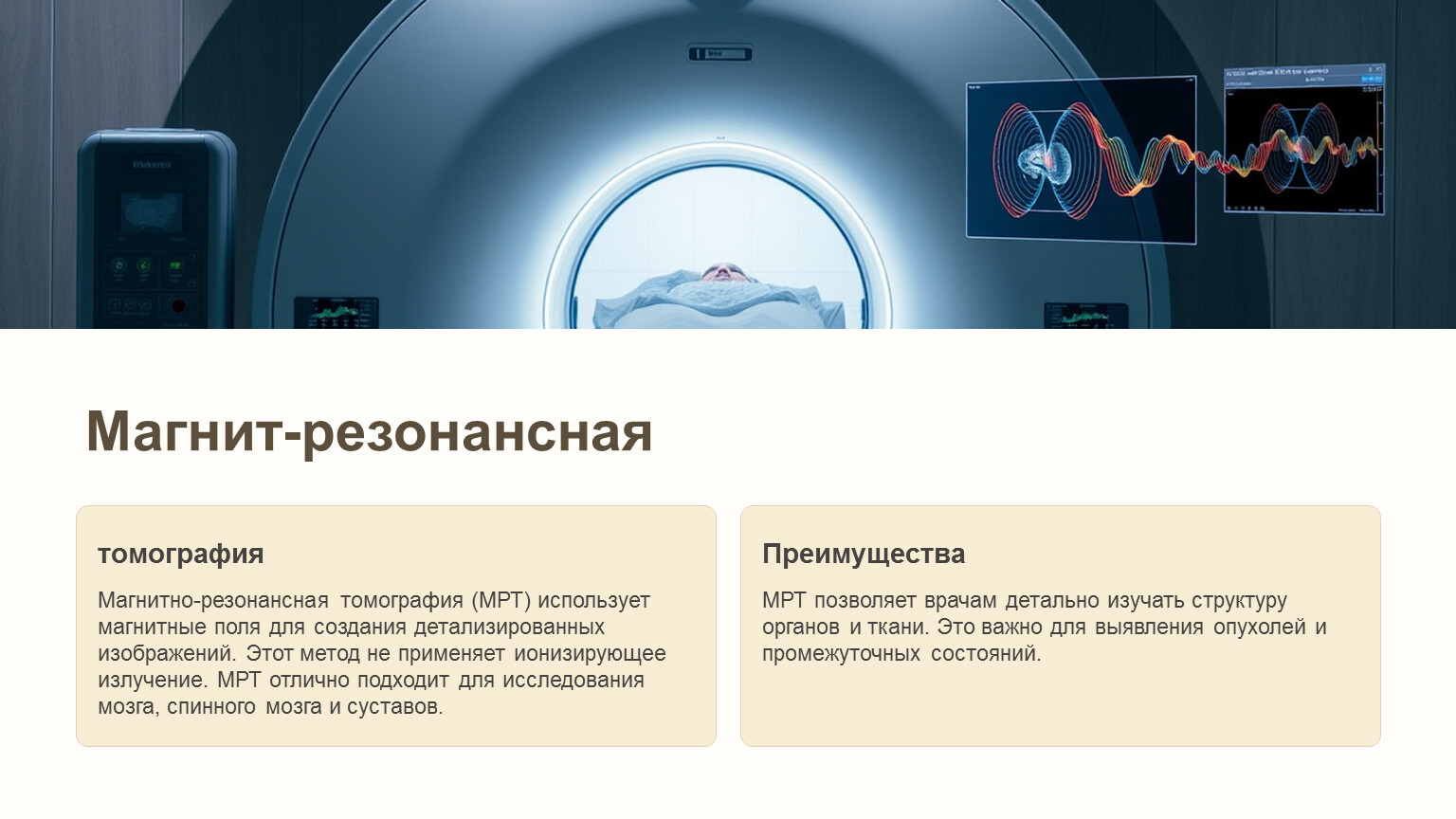 Магнитно-резонансная томография (МРТ) использует магнитные поля для создания детализированных изображений. Этот метод не применяет ионизирующее излучение. МРТ отлично подходит для исследования мозга, спинного мозга и суставов.
