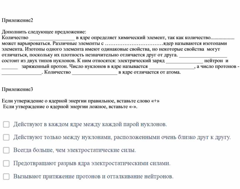 Если утверждение о ядерной энергии ложное, вставьте «-».