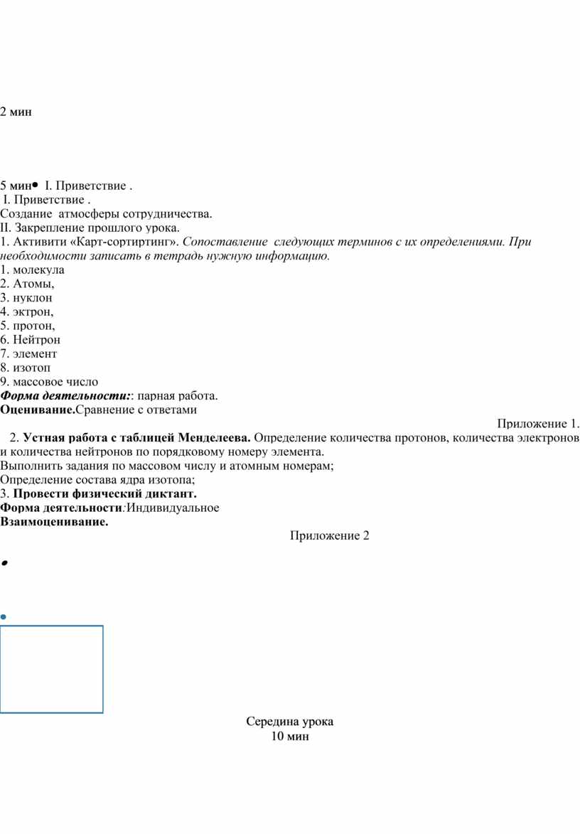 І. Приветствие . Создание атмосферы сотрудничества. II. Закрепление прошлого урока. 1. Активити «Карт-сортиртинг». Сопоставление следующих терминов с их определениями. При необходимости записать в тетрадь нужную информацию. 1. молекула 2. Атомы, 3. нуклон 4. эктрон, 5. протон, 6. Нейтрон 7. элемент 8. изотоп 9. массовое число Форма деятельности:: парная работа. Оценивание.Сравнение с ответами Приложение 1. 2. Устная работа с таблицей Менделеева. Определение количества протонов, количества электронов и количества нейтронов по порядковому номеру элемента. Выполнить задания по массовом числу и атомным номерам; Определение состава ядра изотопа; 3. Провести физический диктант. Форма деятельности:Индивидуальное Взаимоценивание. Приложение 2