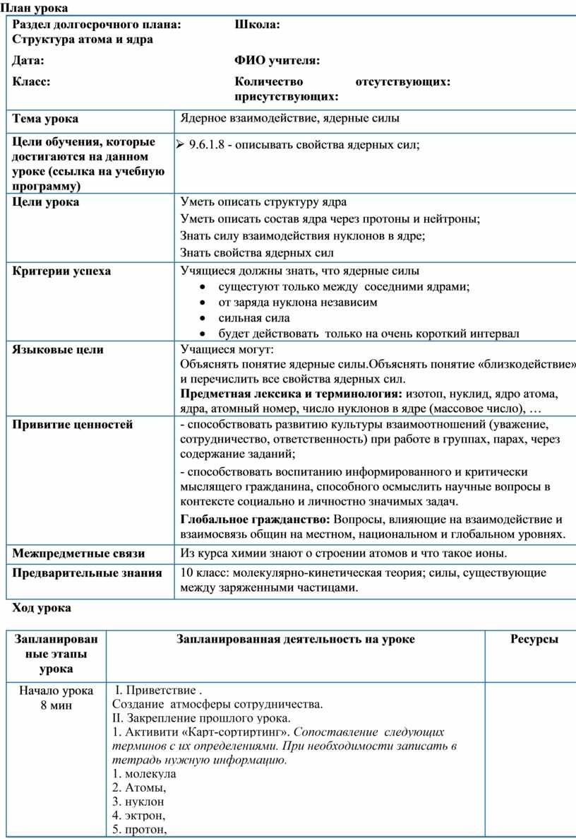 Раздел долгосрочного плана: Структура атома и ядра |