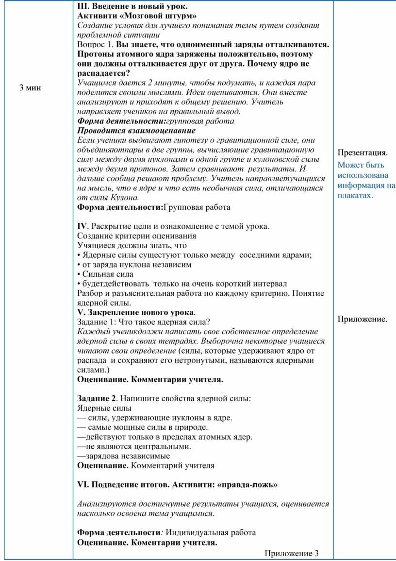 III. Введение в новый урок. Активити «Мозговой штурм» Создание условия для лучшего понимания темы путем создания проблемной ситуации Вопрос 1. Вы знаете, что одноименный заряды отталкиваются. Протоны атомного ядра заряжены положительно, поэтому они должны отталкивается друг от друга. Почему ядро не распадается? Учащимся дается 2 минуты, чтобы подумать, и каждая пара поделится своими мыслями. Идеи оцениваются. Они вместе анализируют и приходят к общему решению. Учитель направляет учеников на правильный вывод. Форма деятельности:групповая работа Проводится взаимооценавние Если ученики выдвигают гипотезу о гравитационной силе, они объединяютпары в две группы, вычисляющие гравитационную силу между двумя нуклонами в одной группе и кулоновской силы между двумя протонов. Затем сравнивают результаты. И дальше сообща решают проблему. Учитель направляетучащихся на мысль, что в ядре и что есть необычная сила, отличающаяся от силы Кулона. Форма деятельности:Групповая работа