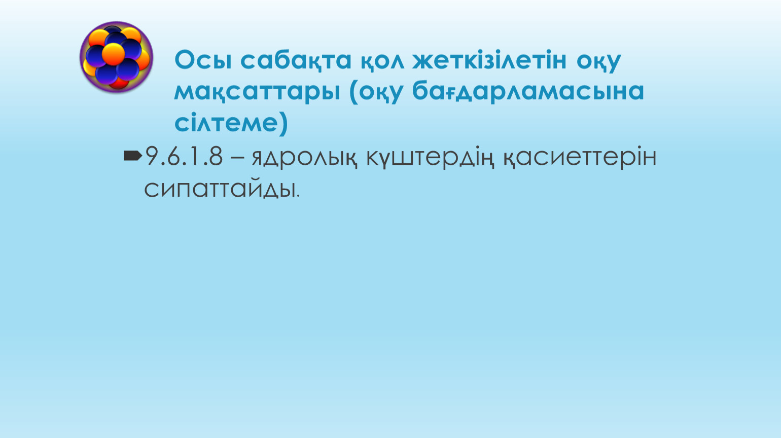 9.6.1.8 – ядролық күштердің қасиеттерін сипаттайды.