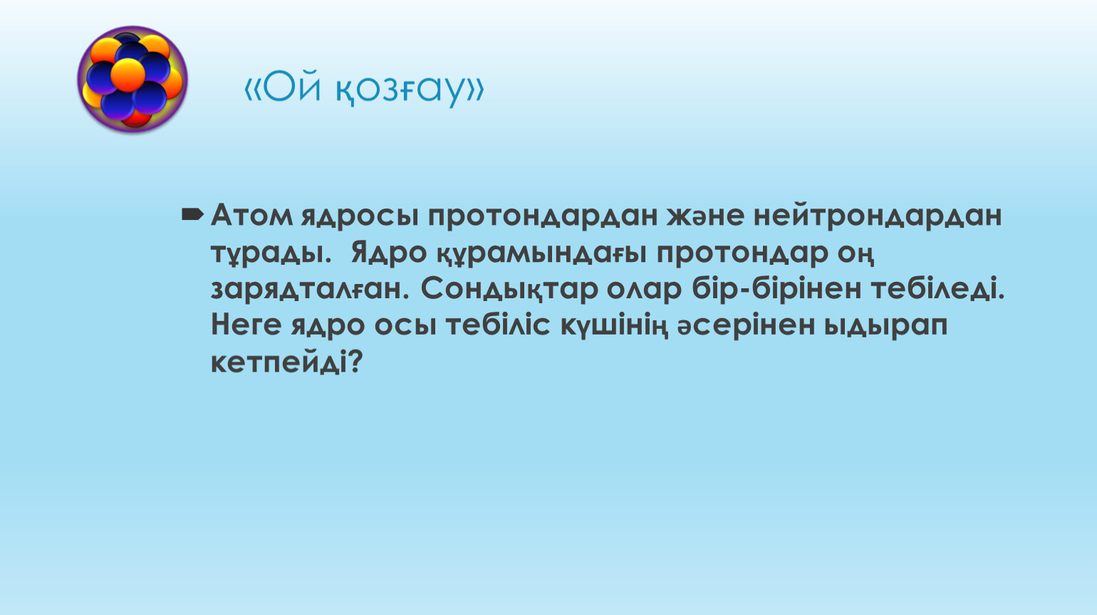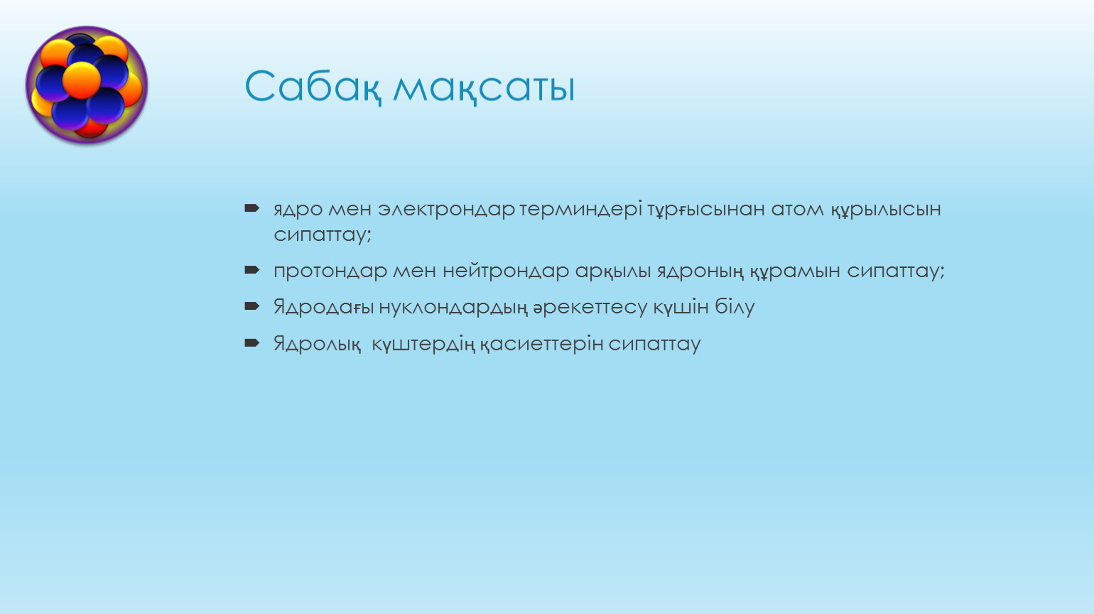 ядро мен электрондар терминдері тұрғысынан атом құрылысын сипаттау;