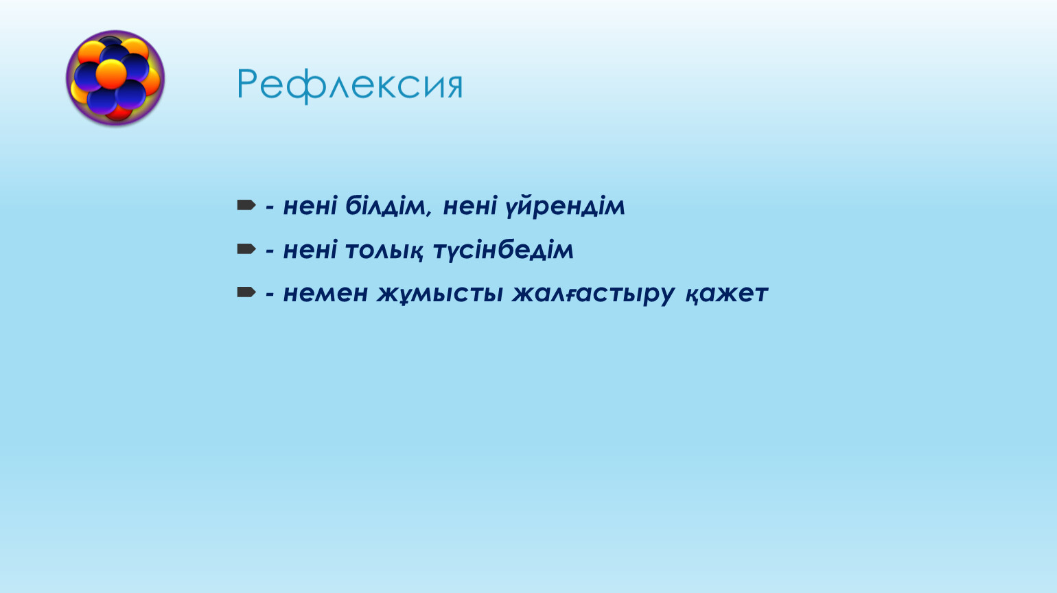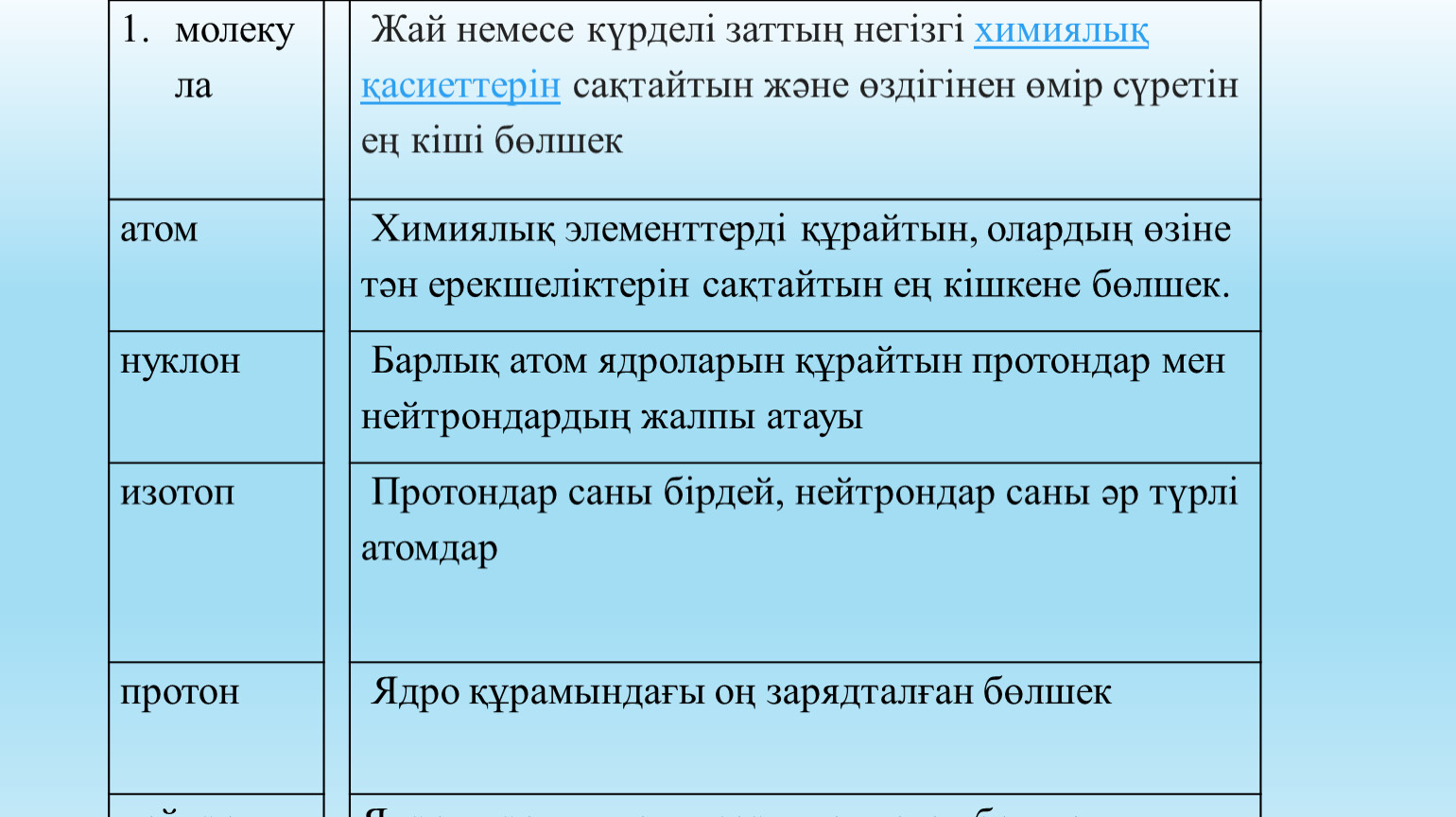 атом | Химиялық элементтерді құрайтын, олардың өзіне тән ерекшеліктерін сақтайтын ең кішкене бөлшек. | |