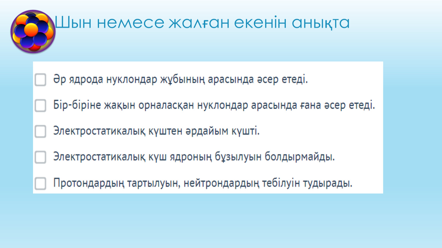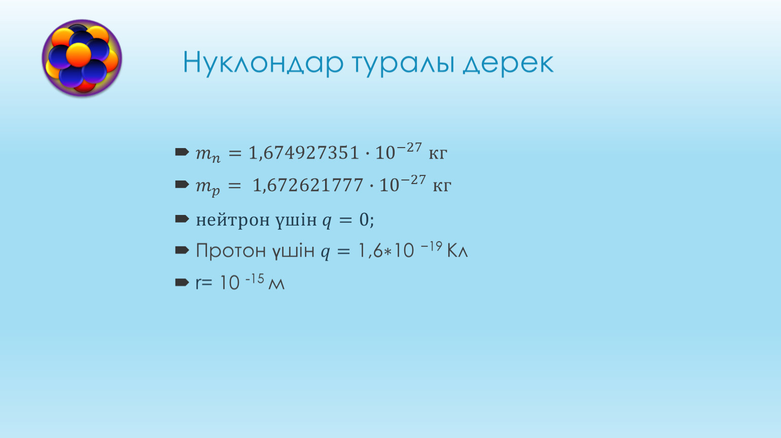 __________________ нуклонның екі түрінен тұрады. Олар: электр заряды ______________ нейтрондар мен ______ зарядталған протондар. Ядродағы нуклондар саны атомның ________________ , ал протондар саны _______________ деп аталады. Ядродағы _________________ саны атомды ерекшелейді.