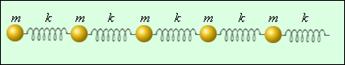 (W) Характерной особенностью механических волн является то, что они распространяются в материальных средах (твердых, жидких или газообразных). Существуют волны, которые способны распространяться и в пустоте (например, световые волны). Для механических волн обязательно нужна среда, обладающая способностью запасать кинетическую и потенциальную энергию. Следовательно, среда должна обладать инертными и упругими свойствами. В реальных средах эти свойства распределены по всему объему. Так, например, любой малый элемент твердого тела обладает массой и упругостью. В простейшей одномерной модели твердое тело можно представить как совокупность шариков и пружинок (рисунок 3).