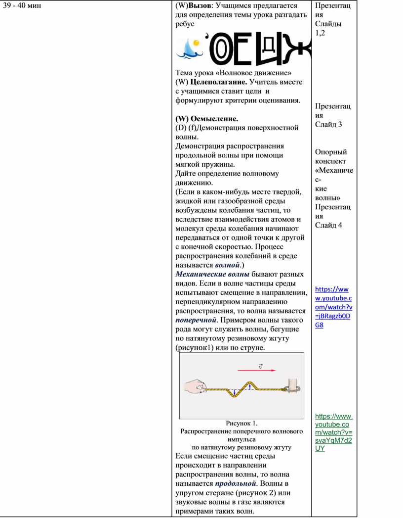 (W) Осмысление. (D) (f)Демонстрация поверхностной волны. Демонстрация распространения продольной волны при помощи мягкой пружины. Дайте определение волновому движению. (Если в каком-нибудь месте твердой, жидкой или газообразной среды возбуждены колебания частиц, то вследствие взаимодействия атомов и молекул среды колебания начинают передаваться от одной точки к другой с конечной скоростью. Процесс распространения колебаний в среде называется волной.) Механические волны бывают разных видов. Если в волне частицы среды испытывают смещение в направлении, перпендикулярном направлению распространения, то волна называется поперечной. Примером волны такого рода могут служить волны, бегущие по натянутому резиновому жгуту (рисунок1) или по струне.