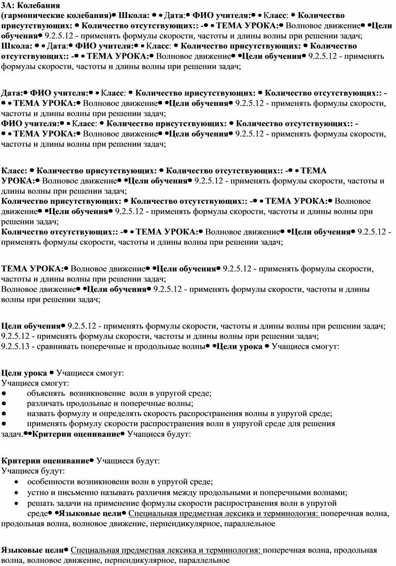 9.2.5.12 - применять формулы скорости, частоты и длины волны при решении задач; 9.2.5.13 - сравнивать поперечные и продольные волны |