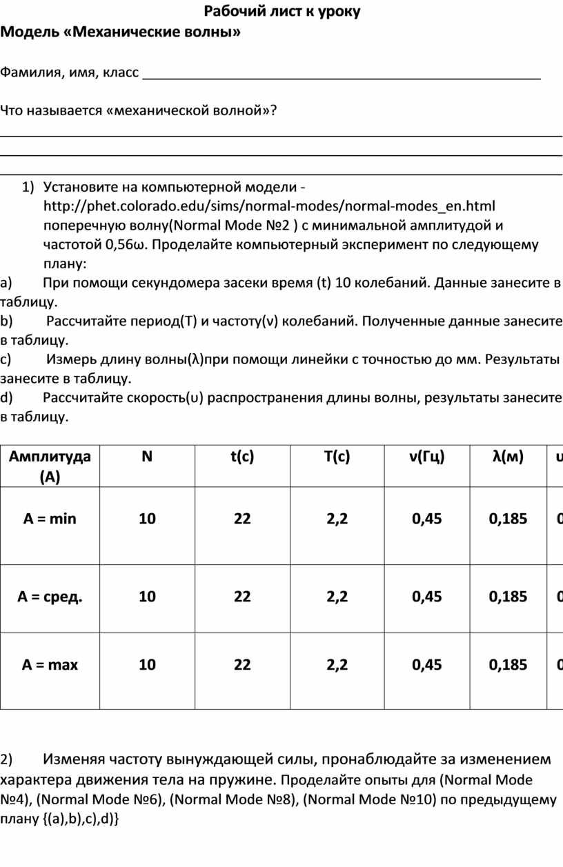 1) Установите на компьютерной модели - http://phet.colorado.edu/sims/normal-modes/normal-modes_en.html поперечную волну(Normal Mode №2 ) с минимальной амплитудой и частотой 0,56ω. Проделайте компьютерный эксперимент по следующему плану: