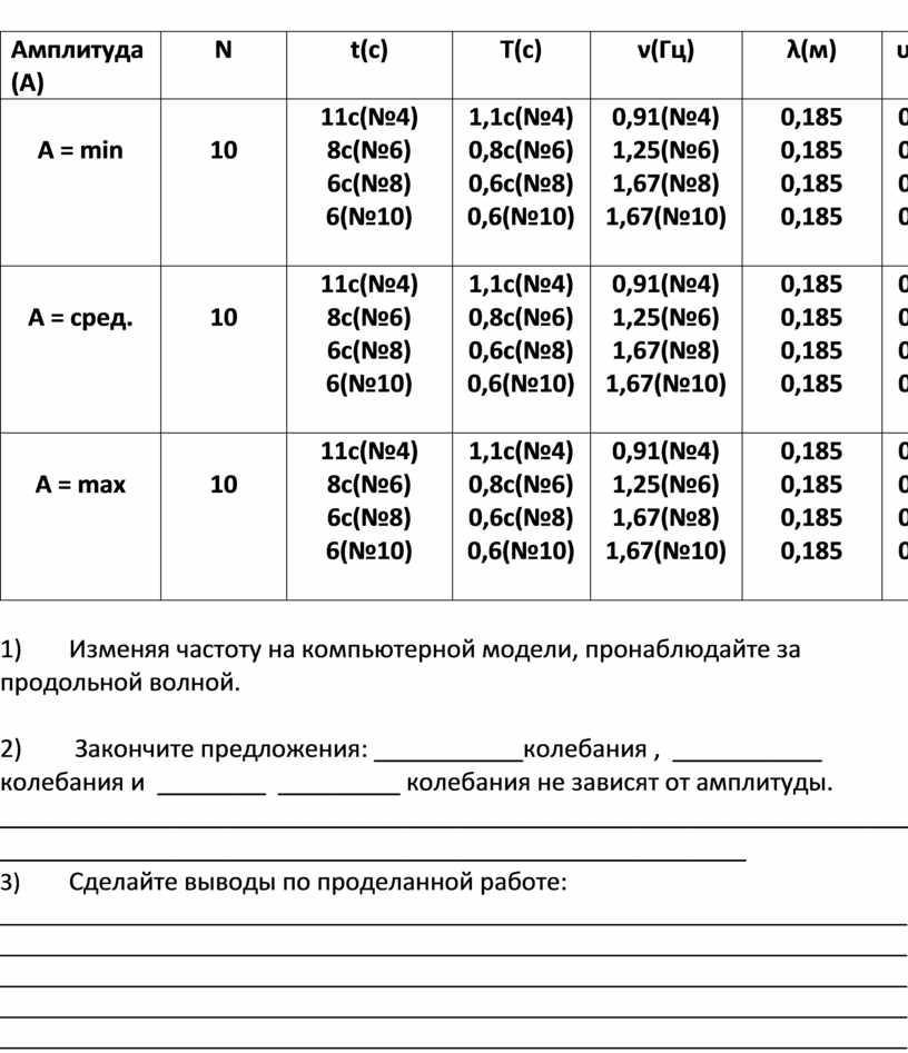 c) Измерь длину волны(λ)при помощи линейки с точностью до мм. Результаты занесите в таблицу.