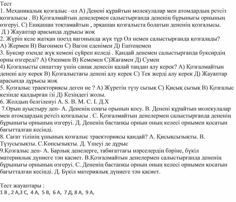 1. Механикалық қозғалыс –ол А) Денені құрайтын молекулалар мен атомдардың ретсіз қозғалысы . В) Қозғалмайтын денелермен салыстырғанда дененің бұрынығы орнының өзгеруі. С) Ешқашан тоқтамайтын , әрқашан қозғалыста болатын дененің қозғалысы.