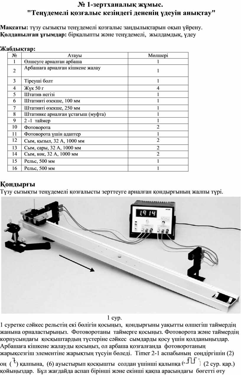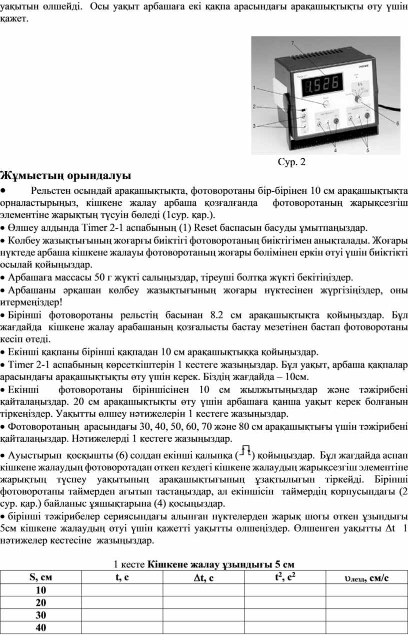 · Timer 2-1 аспабының көрсеткіштерін 1 кестеге жазыңыздар. Бұл уақыт, арбаша қақпалар арасындағы арақашықтықты өту үшін керек. Біздің жағдайда – 10см.