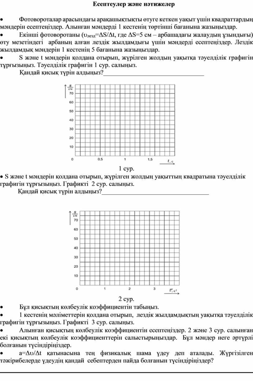 · Екінші фотоворотаны (uлезд=ΔS/Δt, где ΔS=5 см – арбашадағы жалаудың ұзындығы) өту мезетіндегі арбаның алған лездік жылдамдығы үшін мәндерді есептеңіздер. Лездік жылдамдық мәндерін 1 кестенің 5 бағанына жазыңыздар.