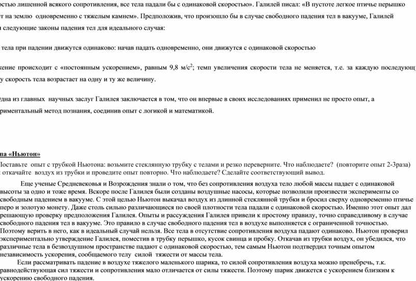 Еще ученые Средневековья и Возрождения знали о том, что без сопротивления воздуха тело любой массы падает с одинаковой высоты за одно и тоже время. Вскоре после Галилея были созданы воздушные насосы, которые позволили произвести эксперименты со свободным падением в вакууме. С этой целью Ньютон выкачал воздух из длинной стеклянной трубки и бросил сверху одновременно птичье перо и золотую монету. Даже столь сильно различающиеся по своей плотности тела падали с одинаковой скоростью. Именно этот опыт дал решающую проверку предположения Галилея. Опыты и рассуждения Галилея привели к простому правилу, точно справедливому в случае свободного падения тел в вакууме. Это правило в случае свободного падения тел в воздухе выполняется с ограниченной точностью. Поэтому верить в него, как в идеальный случай нельзя. Все тела в отсутствие сопротивления воздуха падают одинаково. Ньютон проверил экспериментально утверждение Галилея, поместив в трубку перышко, кусок свинца и пробку. Откачав из трубки воздух, он убедился, что различные тела в безвоздушном пространстве падают с одинаковой скоростью, тем самым Ньютон подтвердил точным опытом независимость ускорения, сообщаемого телу силой тяжести от массы тела.