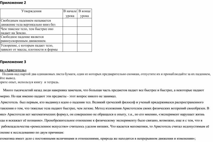 Аристотель был первым, кто выдвинул идею о падении тел. Великий греческий философ и ученый придерживался распространенного представления о том, что тяжелые тела падают быстрее, чем легкие. Метод изложения Аристотелем своих физических воззрений своеобразен. В «Физике» Аристотеля нет математических формул, он совершенно не обращался к опыту, т.к., по его мнению, «эксперимент нарушает жизнь природы и искажает её познание». Пренебрежительное отношение к физическому эксперименту было связано, возможно, еще и с тем, что в эпоху рабовладельчества «ремесленное искусство» считалось уделом низших. Что касается математики, то Аристотель считал недопустимым её применение к исследованию по двум причинам: