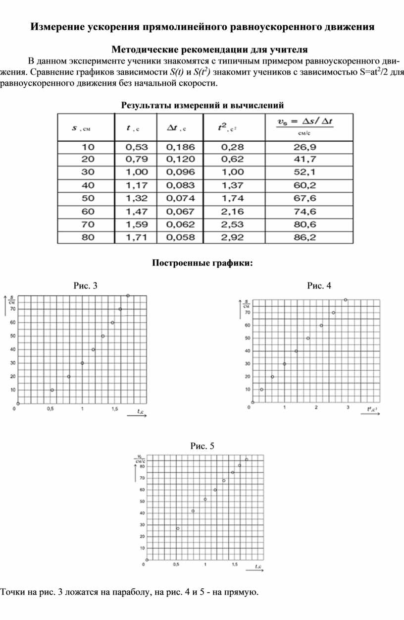 В данном эксперименте ученики знакомятся с типичным примером равноускоренного движения. Сравнение графиков зависимости S(t) и S(t2) знакомит учеников с зависимостью S=at2/2 для равноускоренного движения без начальной скорости.
