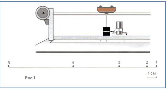 На рисунке показана подвижная тележка, скатывающаяся вниз. На ней установлена капельница. Капли падают равномерно через 0,5 с и оставляют на плоскости следы. Если на плоскость положить полоску бумаги и после проведения опыта ее снять, то получают картину, показанную на рисунке 1.
