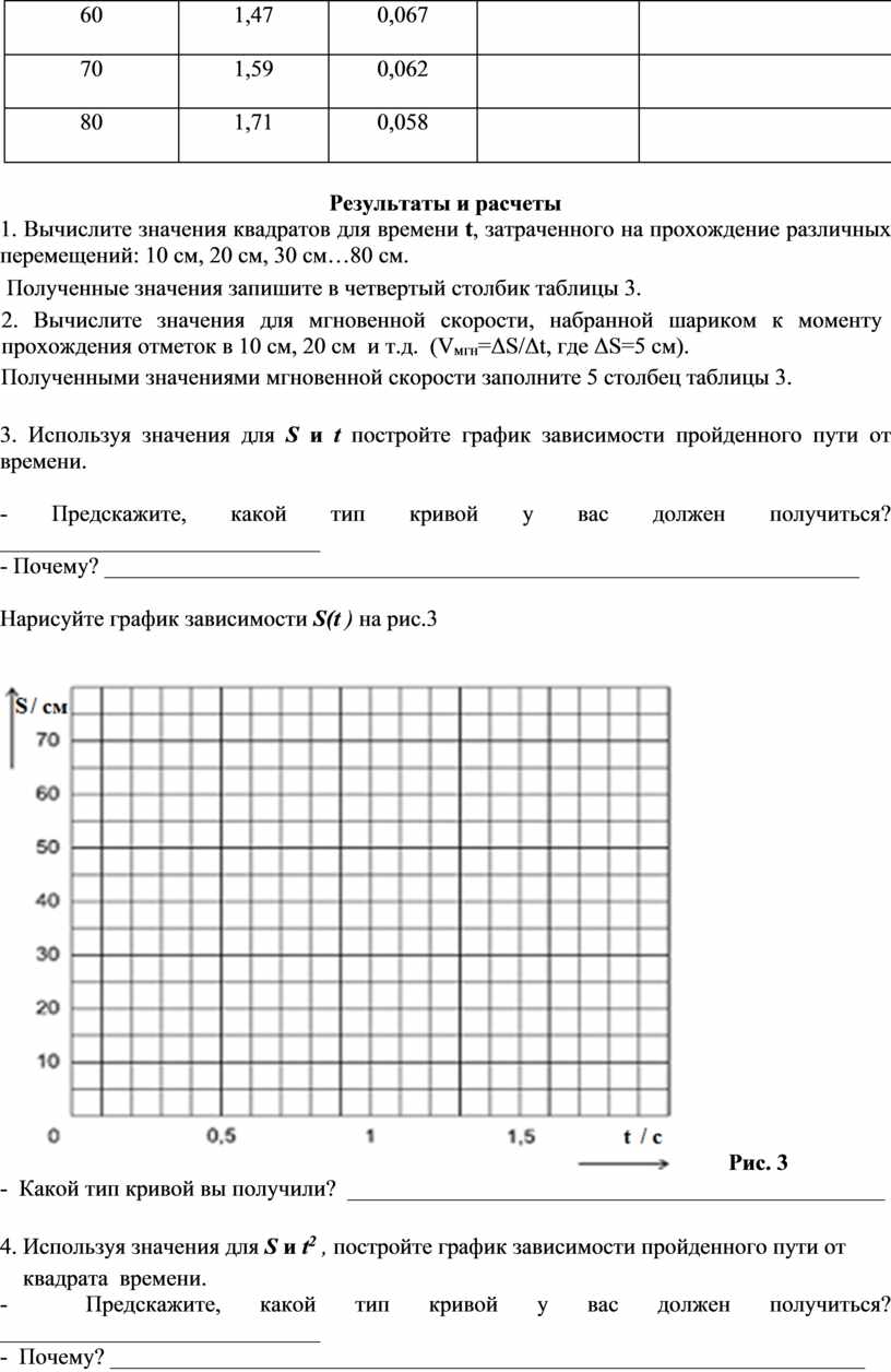 1. Вычислите значения квадратов для времени t, затраченного на прохождение различных перемещений: 10 см, 20 см, 30 см…80 см.