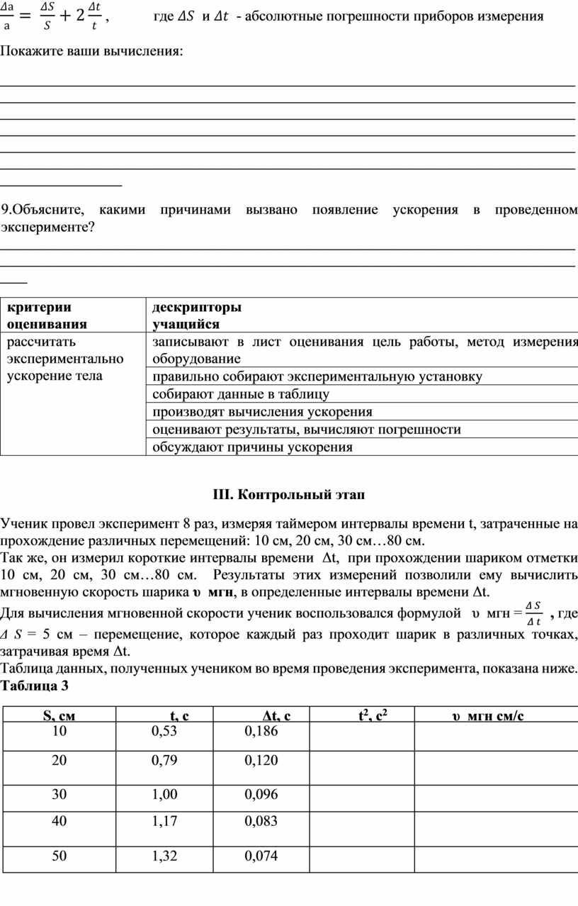 2. Вычислите значения для мгновенной скорости, набранной шариком к моменту прохождения отметок в 10 см, 20 см и т.д. (Vмгн=ΔS/Δt, где ΔS=5 см).