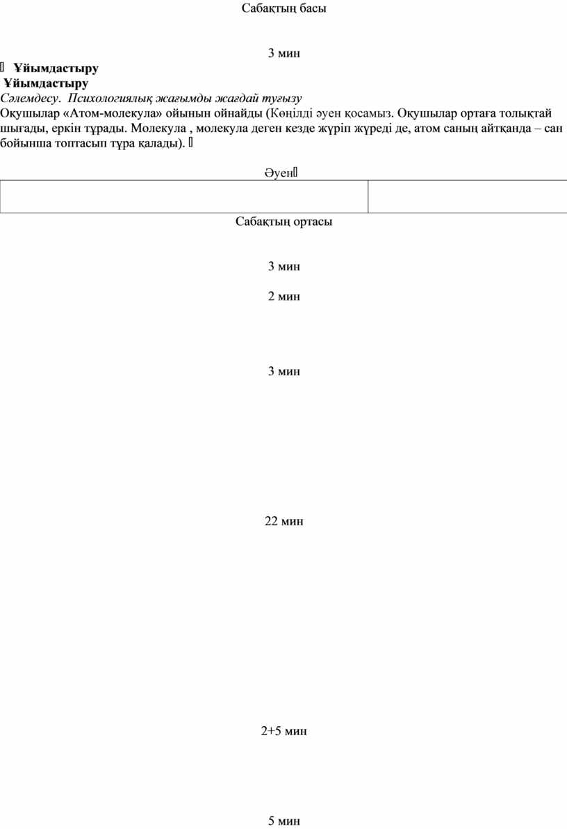 Ұйымдастыру Сәлемдесу. Психологиялық жағымды жағдай туғызу Оқушылар «Атом-молекула» ойынын ойнайды (Көңілді әуен қосамыз. Оқушылар ортаға толықтай шығады, еркін тұрады. Молекула , молекула деген кезде жүріп жүреді де, атом саның айтқанда – сан бойынша топтасып тұра қалады). |