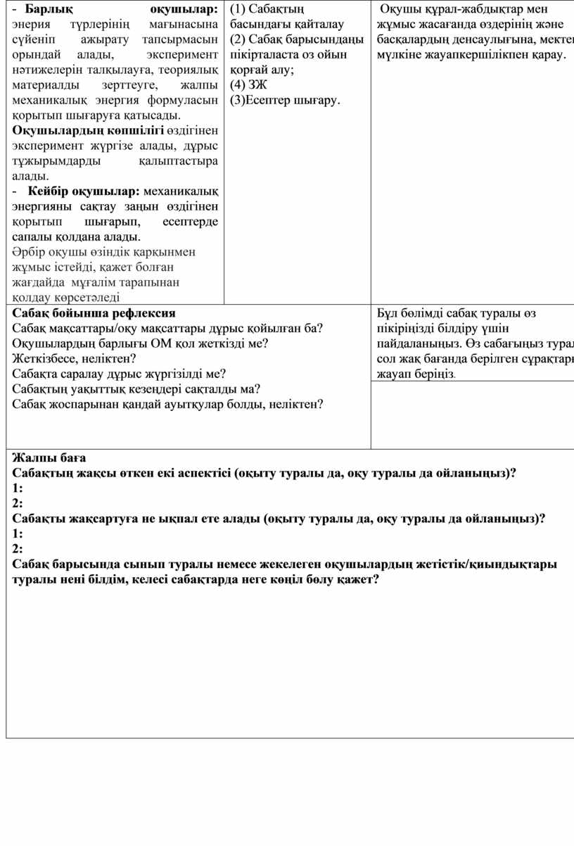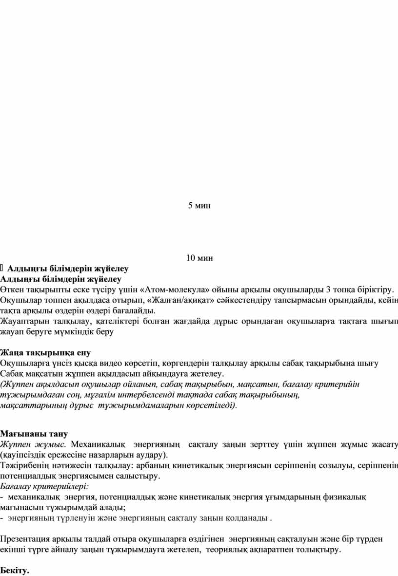 «Джигсо» әдісін қолданып деңгейлік есептреді шығару. Алдымен оқушыларға білдіртпей орындықтарынын артына үш түсті 1,2,3 сандары жазылған стикерлерін жабыстыру (жасырынды саралау). Оқушыларды түс бойынша 3 топқа біріктіру, топта ақылдаса отырып әр оқушы өз дәптеріне есептердің шешу жолын жазып алады. Бағалау критерийлері: - механикалық энергия, потенциалдық және кинетикалық энергия ұғымдарының физикалық мағынасын тұжырымдай алады; - энергияның түрленуін және энергияның сақталу заңын қолданады . Дескрипторлар: - Энергия түрін ажырата алады; - Сынақ денесін анықтай алады; - Денелердің бастапқы және сонғы орналасуын анықтай алады; - Есептеуге қажет формуланы жазады; - Формуланы түрлендіре алады; - Сауаттылық (терминология, сөз тіркестері дұрыс пайдалана алады); - Есептеулерді дұрыс орындайды.