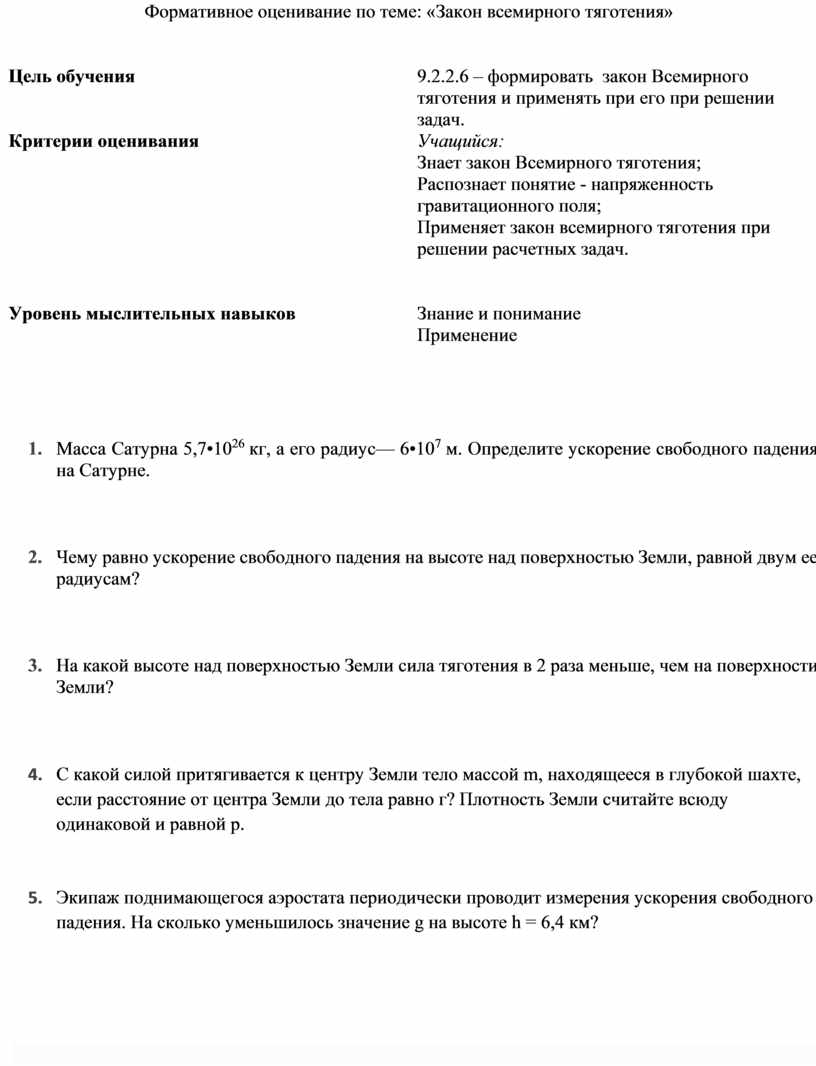 Формативное оценивание по теме: «Закон всемирного тяготения»