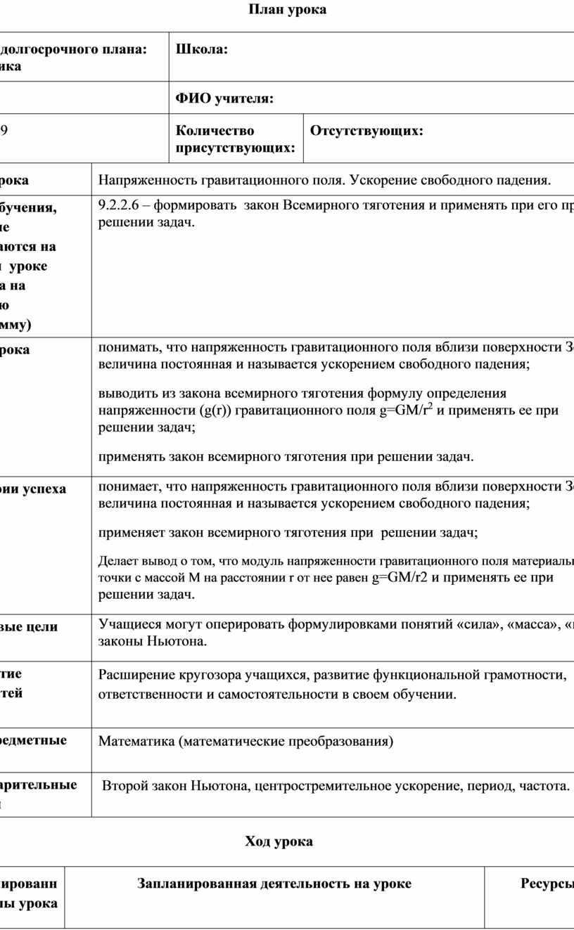 понимать, что напряженность гравитационного поля вблизи поверхности Земли величина постоянная и называется ускорением свободного падения; выводить из закона всемирного тяготения формулу определения напряженности (g(r)) гравитационного поля g=GM/r2 и применять ее при решении задач; применять закон всемирного тяготения при решении задач. |
