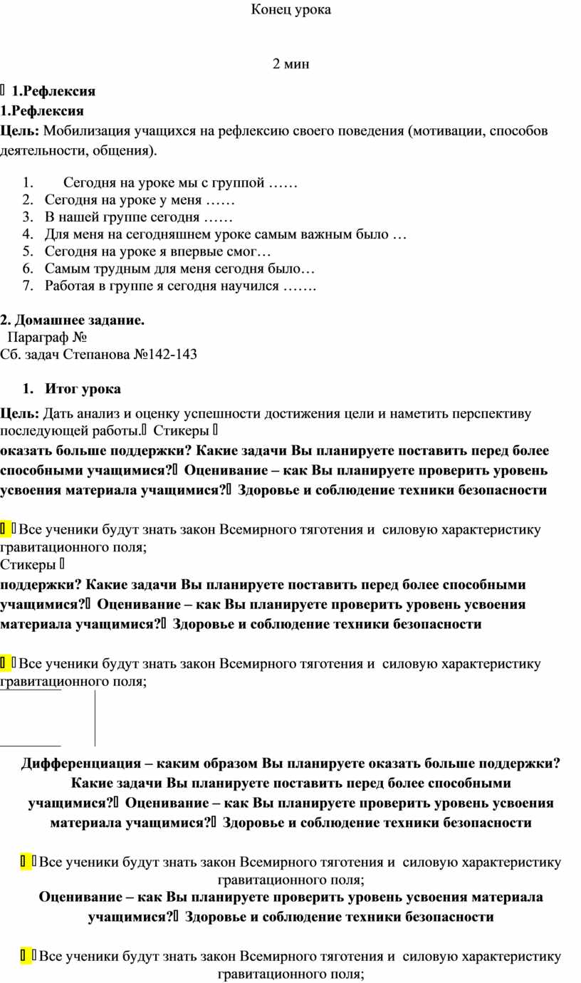 1.Рефлексия Цель: Мобилизация учащихся на рефлексию своего поведения (мотивации, способов деятельности, общения).