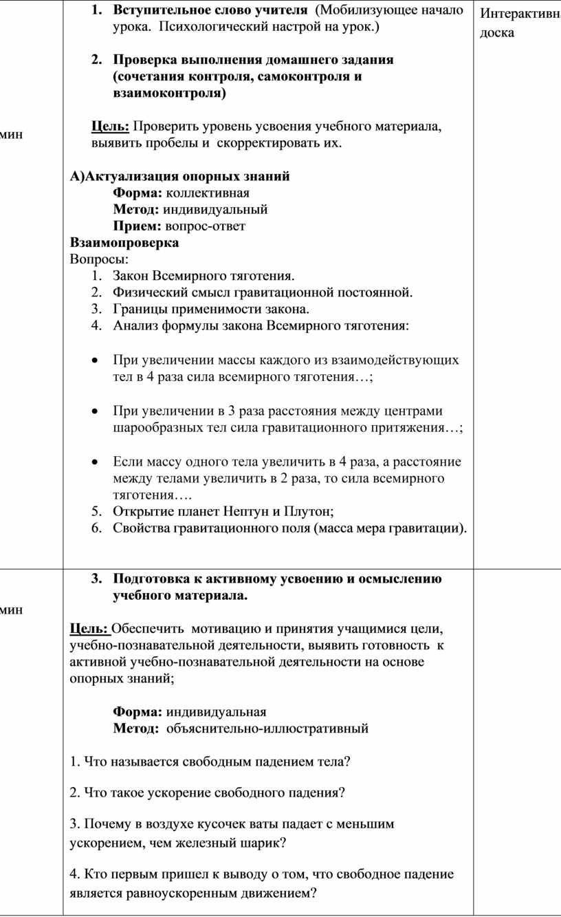 2. Проверка выполнения домашнего задания (сочетания контроля, самоконтроля и взаимоконтроля) Цель: Проверить уровень усвоения учебного материала, выявить пробелы и скорректировать их. А)Актуализация опорных знаний Форма: коллективная Метод: индивидуальный Прием: вопрос-ответ Взаимопроверка Вопросы: 1. Закон Всемирного тяготения. 2. Физический смысл гравитационной постоянной. 3. Границы применимости закона. 4. Анализ формулы закона Всемирного тяготения: · При увеличении массы каждого из взаимодействующих тел в 4 раза сила всемирного тяготения…;