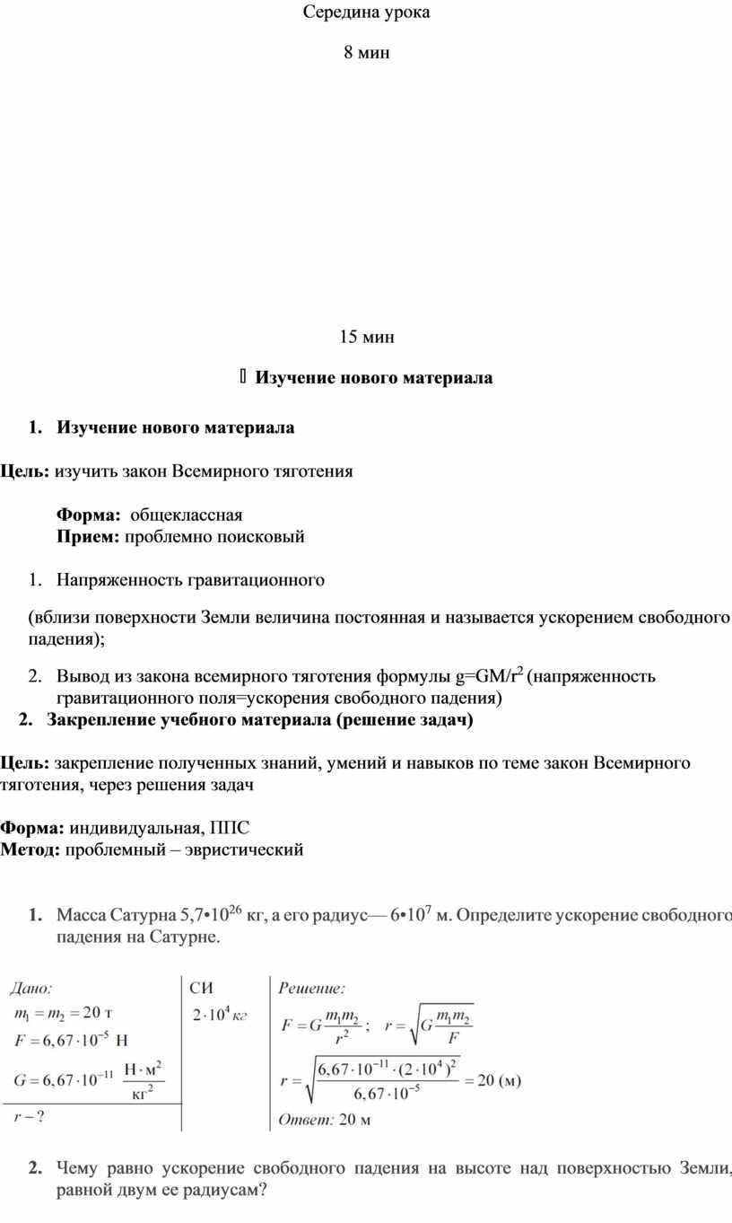 1. Напряженность гравитационного (вблизи поверхности Земли величина постоянная и называется ускорением свободного падения); 2. Вывод из закона всемирного тяготения формулы g=GM/r2 (напряженность гравитационного поля=ускорения свободного падения) 5. Закрепление учебного материала (решение задач)