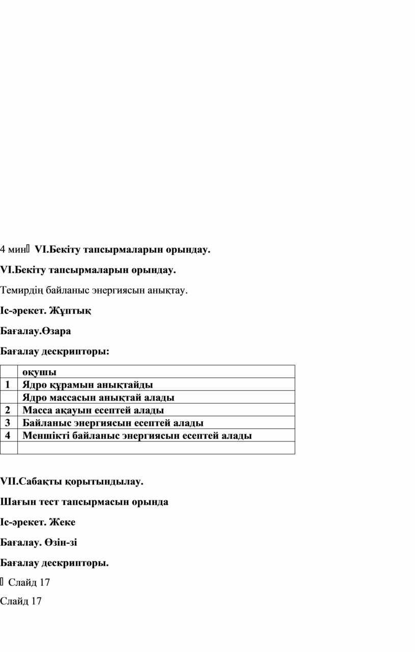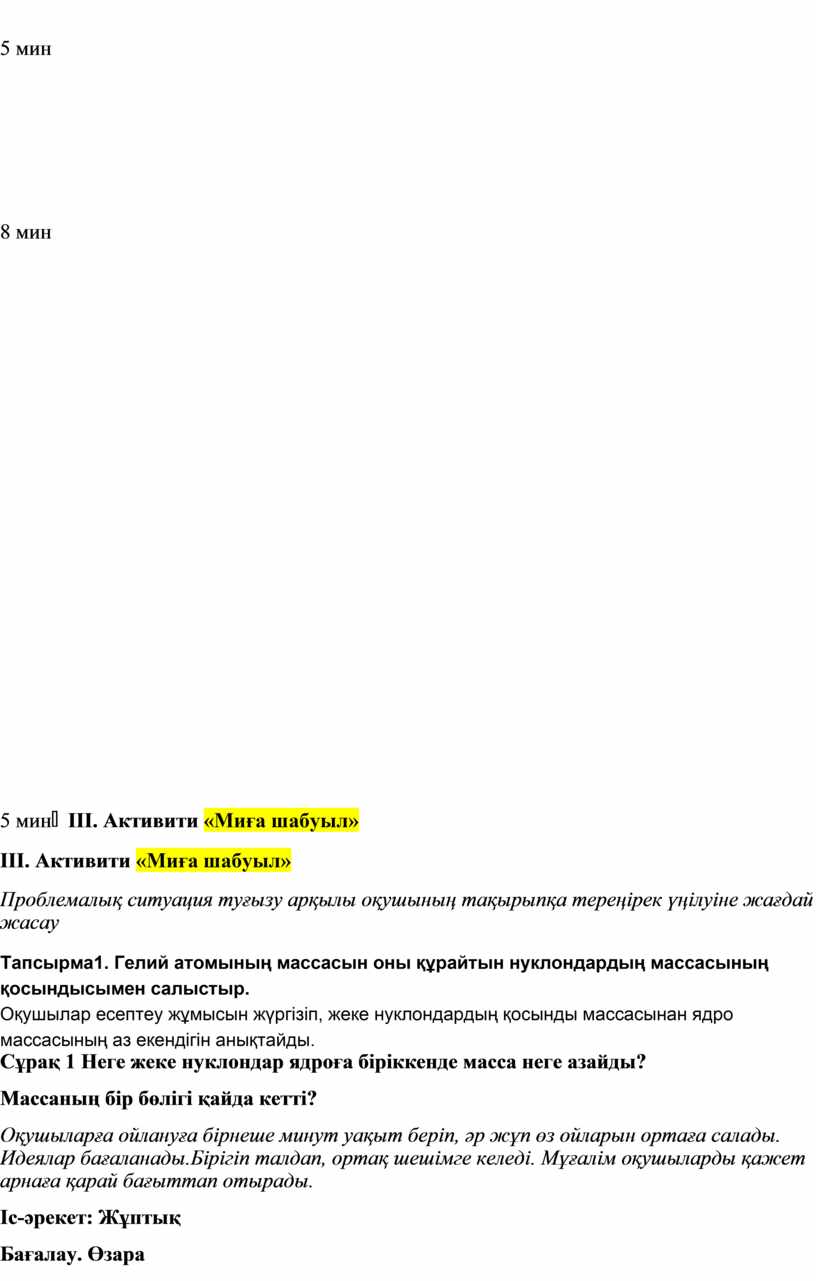 ІІІ. Активити «Миға шабуыл» Проблемалық ситуация туғызу арқылы оқушының тақырыпқа тереңірек үңілуіне жағдай жасау Тапсырма1. Гелий атомының массасын оны құрайтын нуклондардың массасының қосындысымен салыстыр. Оқушылар есептеу жұмысын жүргізіп, жеке нуклондардың қосынды массасынан ядро массасының аз екендігін анықтайды. Сұрақ 1 Неге жеке нуклондар ядроға біріккенде масса неге азайды? Массаның бір бөлігі қайда кетті? Оқушыларға ойлануға бірнеше минут уақыт беріп, әр жұп өз ойларын ортаға салады. Идеялар бағаланады.Бірігіп талдап, ортақ шешімге келеді. Мұғалім оқушыларды қажет арнаға қарай бағыттап отырады. Іс-әрекет: Жұптық Бағалау. Өзара Жалпысыныптық талдау ұйымдастыру. Егер оқушылар тығырыққа тірелетін болса, оларға қолдау көрсету мақсатында Эйнштейннің ұлы формуласын естеріне салу Проблемадан шығу жолын әрі қарай қарастыру. Оқушылар массаның бір бөлігі энергияға айналып кетті деген идеяға келуі керек. Іс-әрекет.Топтық. ІV.Сабақ тақырыбымен таныстырып, сабақ мақсатын ашу. Бағалау критерилерін тағайындау. Оқушыларға масса ақауы деген сұраққа жауап жаздырту. V. Жаңа сабақты пысықтау. 1. Масса ақауы деген не? Оқушылар дәптерлеріне масса ақауының анықтамасын өз беттерінше жазуы тиіс.Бірнеше оқушы өз анықтамасын оқиды.(презентациядағы үлгімен салыстырылады) Масса деффектісі ядроның массасы оны құрыйтын нуклондардың массасынан әрқашан кіші. Олардың айырымы масса ақауы деп аталады. Жалпысыныптық презентация көмегімен жұмыс. 2. Масса ақауын есептеуге бірнеше тапсырма орындау. Ядролық физикадағы өлшем бірліктерге тоқталу Кейбір элемент атомының масса ақауын анықтау Іс-әрекет. Жеке Бағалау.Презентациядағы жауабымен салыстыру арқылы өзін өзі бағалау.