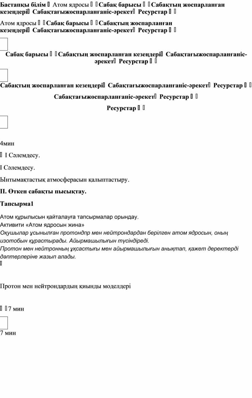 І Сәлемдесу. Ынтымақтастық атмосферасын қалыптастыру. ІІ. Өткен сабақты пысықтау. Тапсырма1 Атом құрылысын қайталауға тапсырмалар орындау. Активити «Атом ядросын жина» Оқушылар ұсынылған протондпр мен нейтрондардан берілген атом ядросын, оның изотобын құрастырады. Айырмашылығын түсіндіреді. Протон мен нейтронның ұқсастығы мен айырмашылығын анықтап, қажет деректерді дәптерлеріне жазып алады.